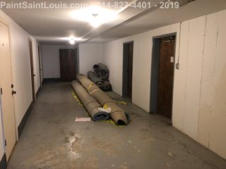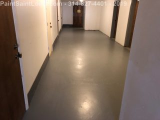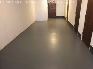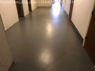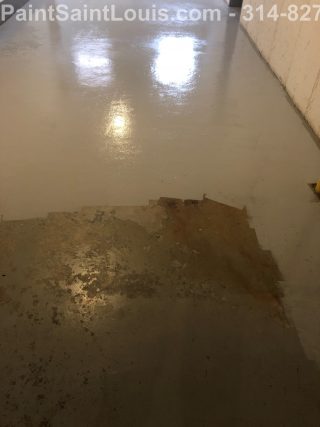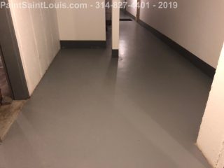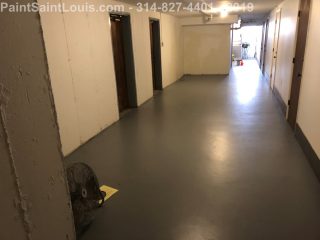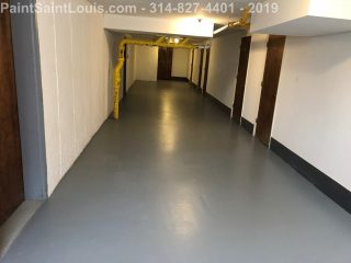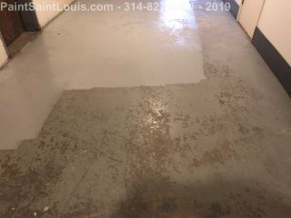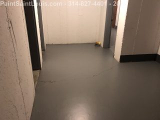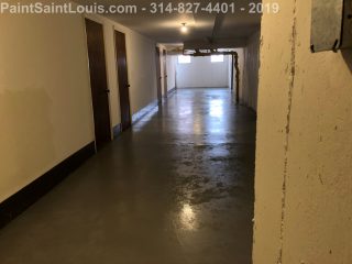 Second trip back to this condo complex. First trip was some wallpaper removal work in their lobby. This trip was to deal with some badly peeling floors in their basement/garage area. This is before, during and after pictures. Although we always suggest doing everything the best method which in this case would have been to strip all existing paint off the concrete floors taking it back to bare concrete, etching, priming, painting then clear coating the customer opted for a repair scenario. We sanded all the floors, used a concrete primer over totally bare areas then primed the entire surface with a extreme bonding primer then doing two coats of one part epoxy over the top. All the photos of light grey were taken after priming and the darker grey was after the epoxy application. This was a one part premixed epoxy designed for garage floors which seemed perfect for a walking surface.