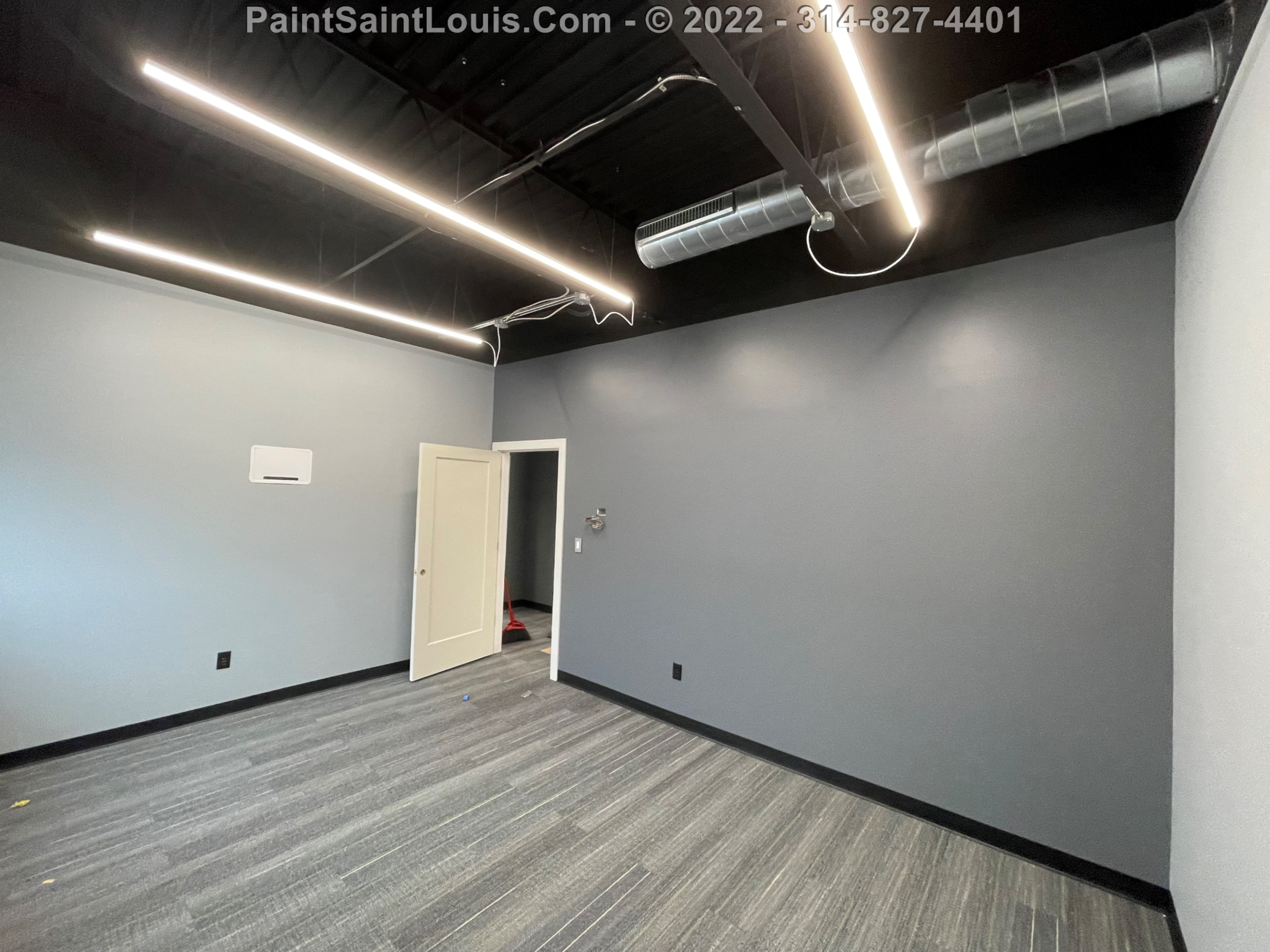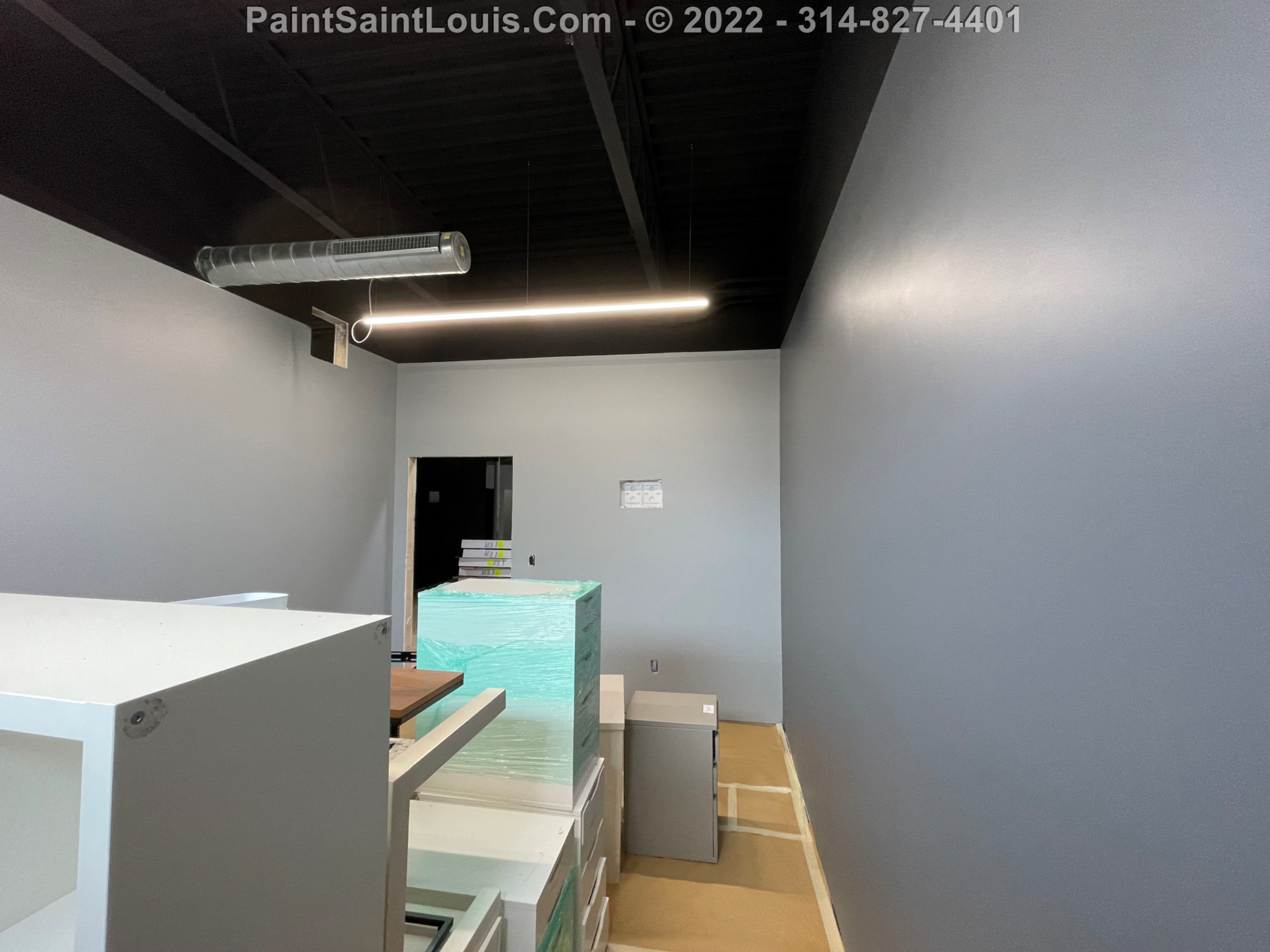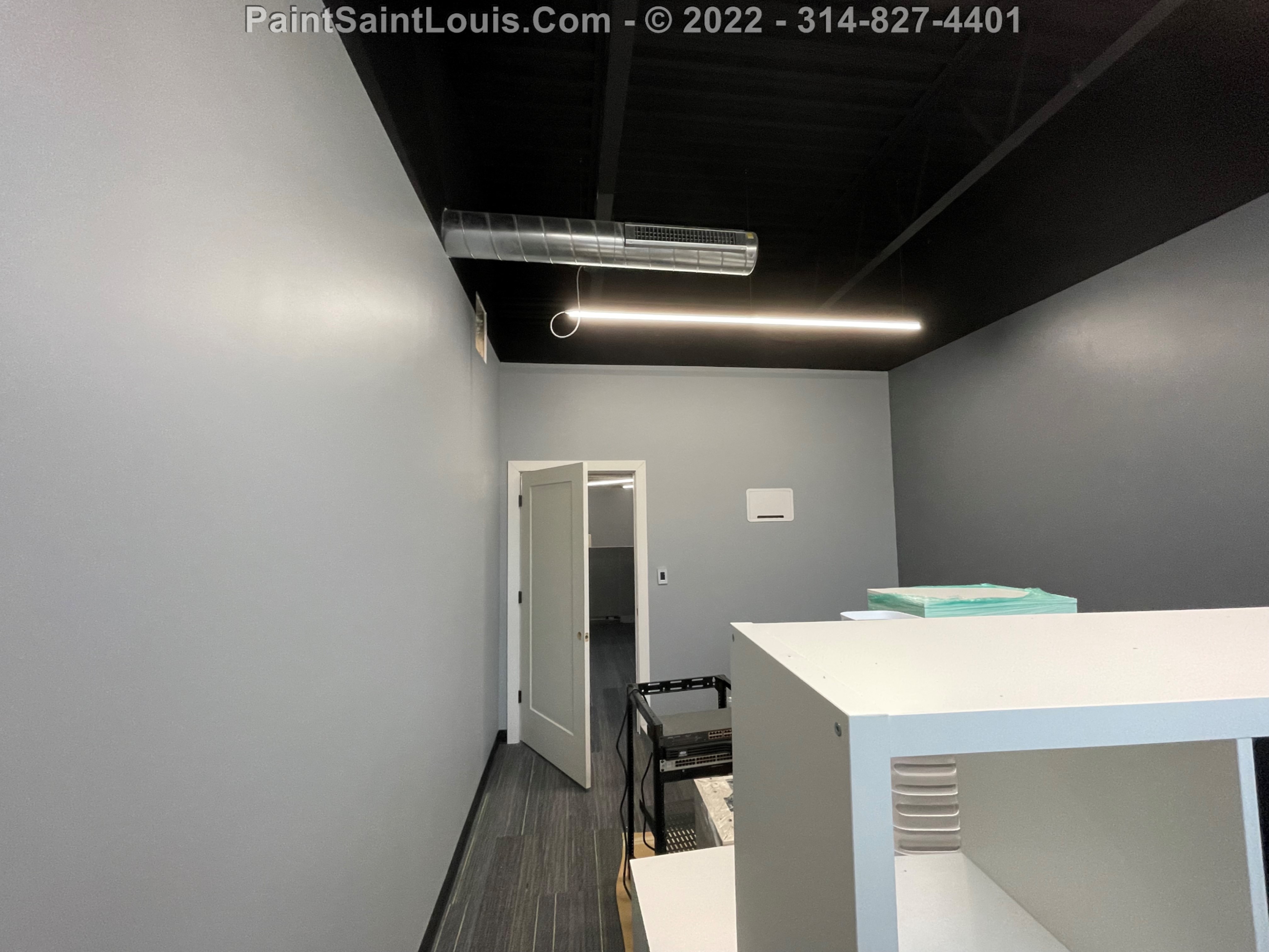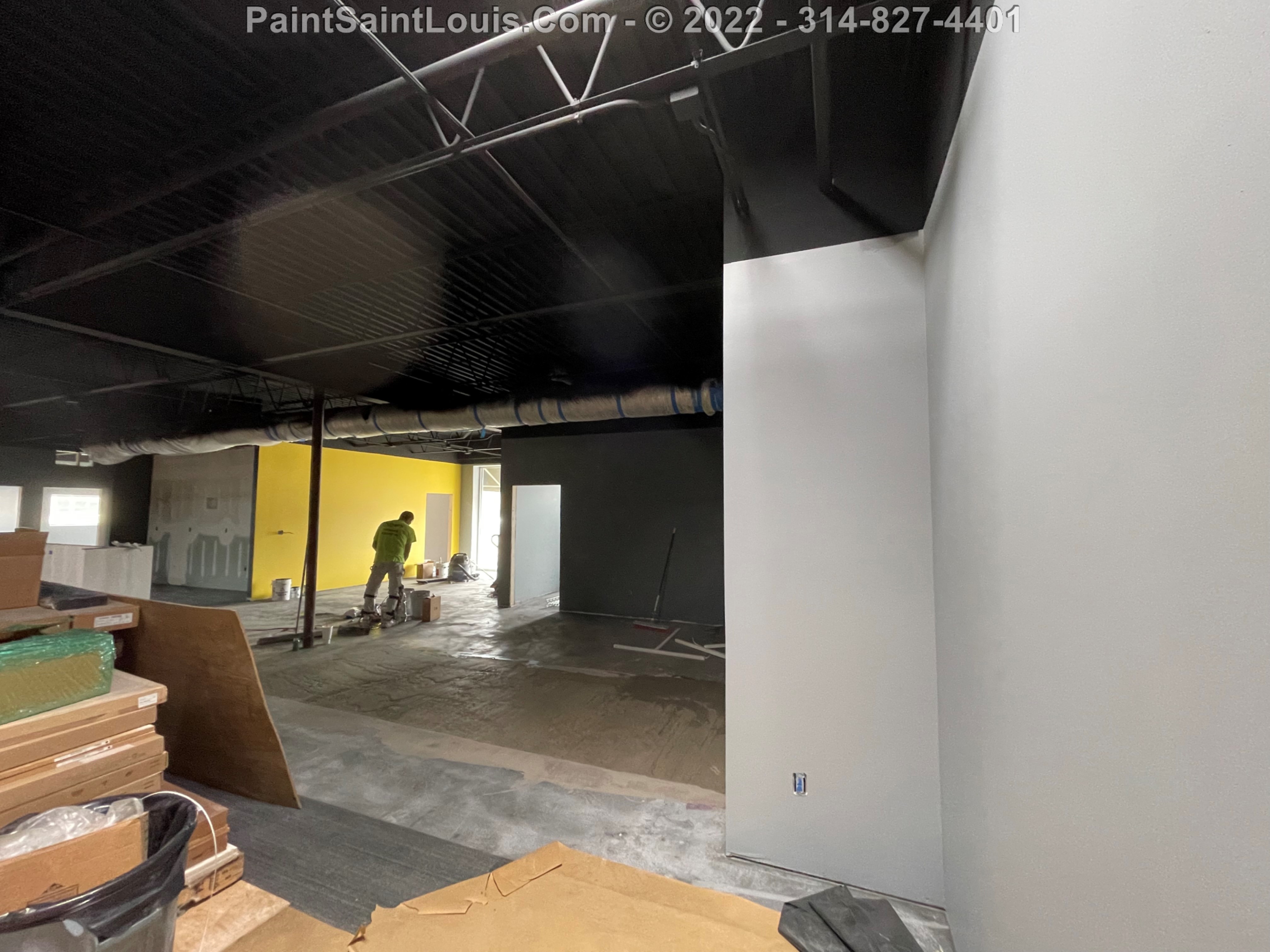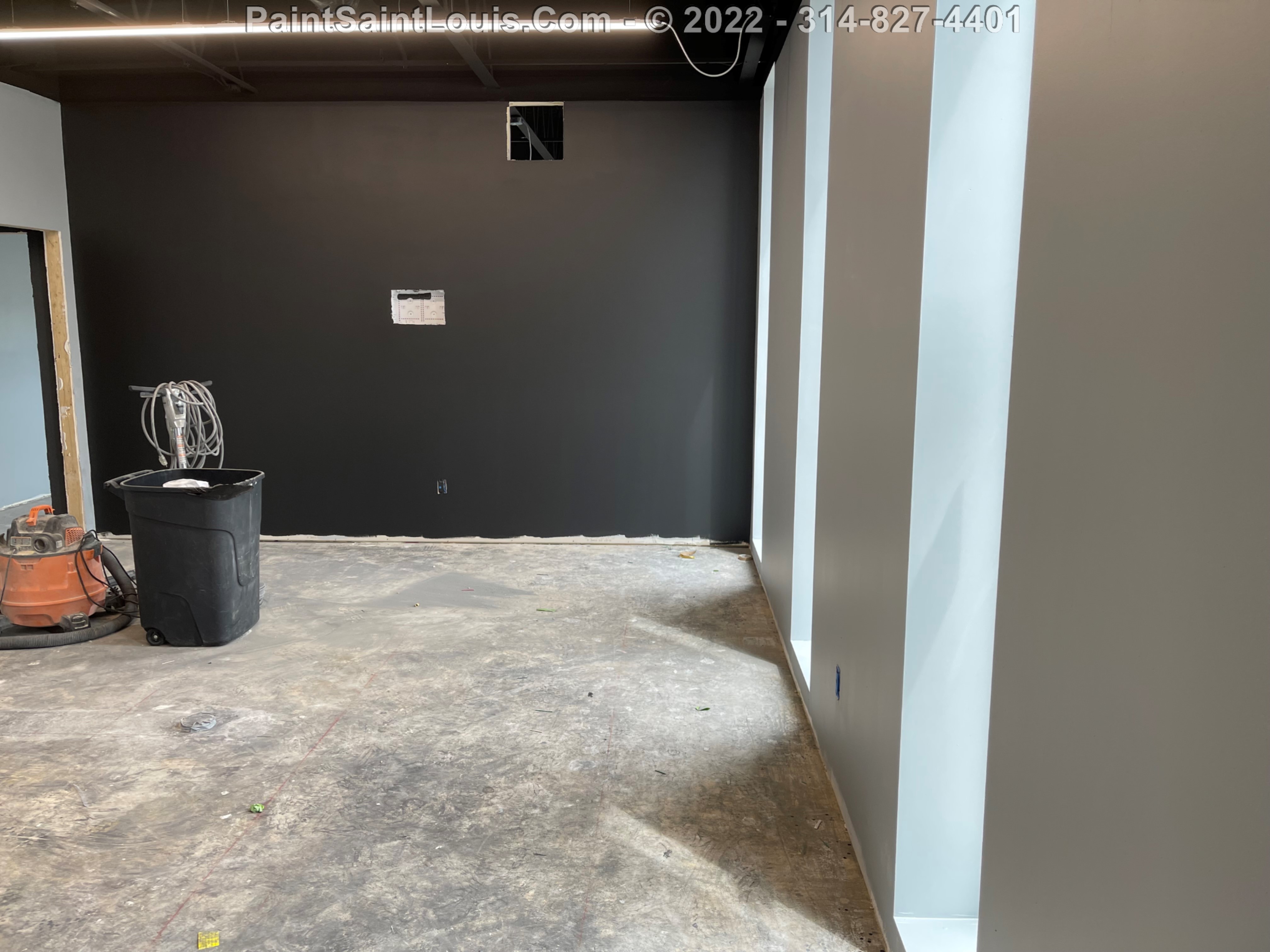 A whole lot of work in a short amount of time. Because of a time crunch we had about two weeks for this project in Brentwood, MO to completely black out the entire ceiling and rafter areas, create an edge line around the entire building without a level surface and paint accent walls in every single room. And it all had to be primed/sealed first. A challenge but definitely not impossible and in the end another successful painting project with a stunning before and after look.