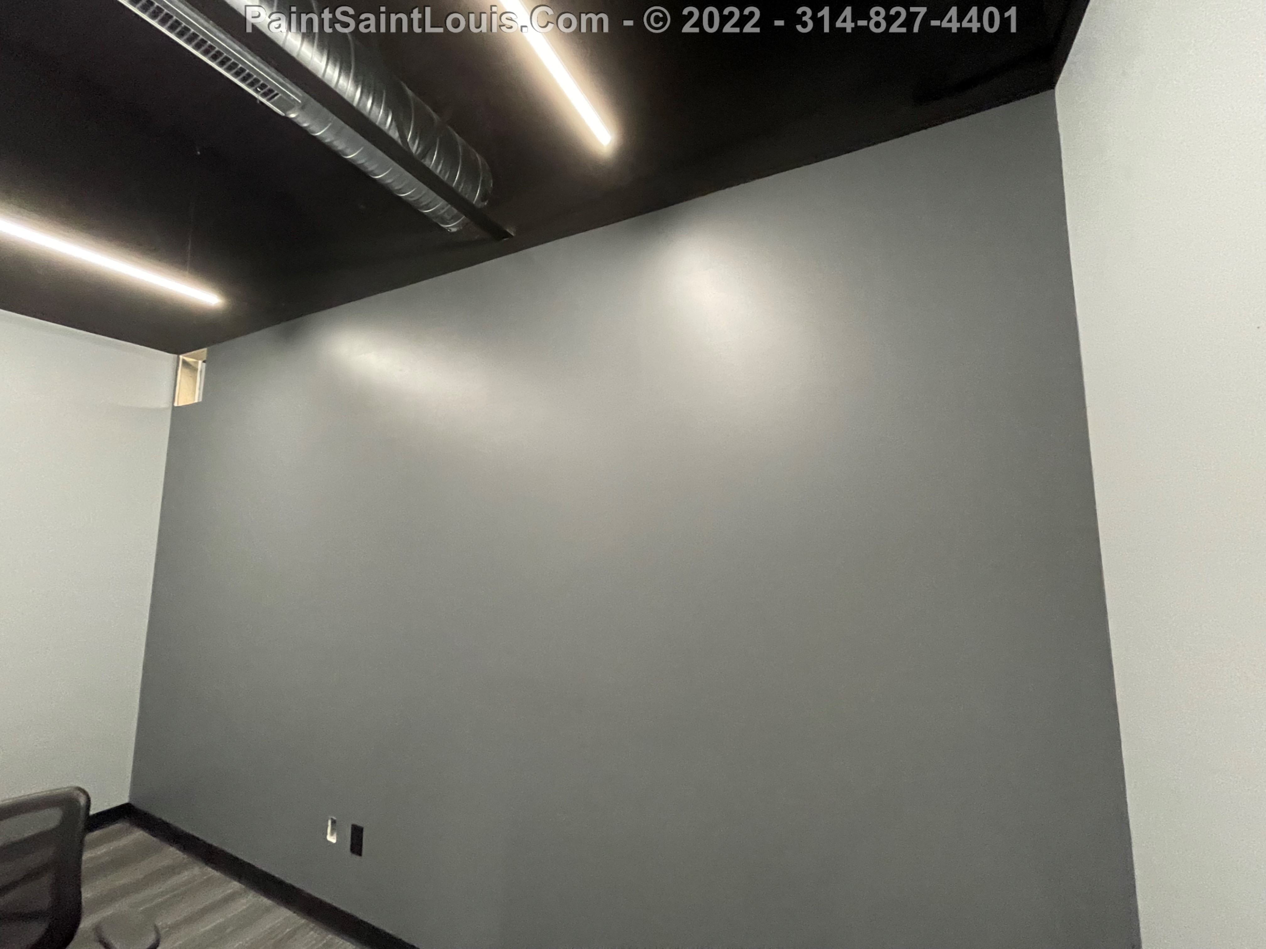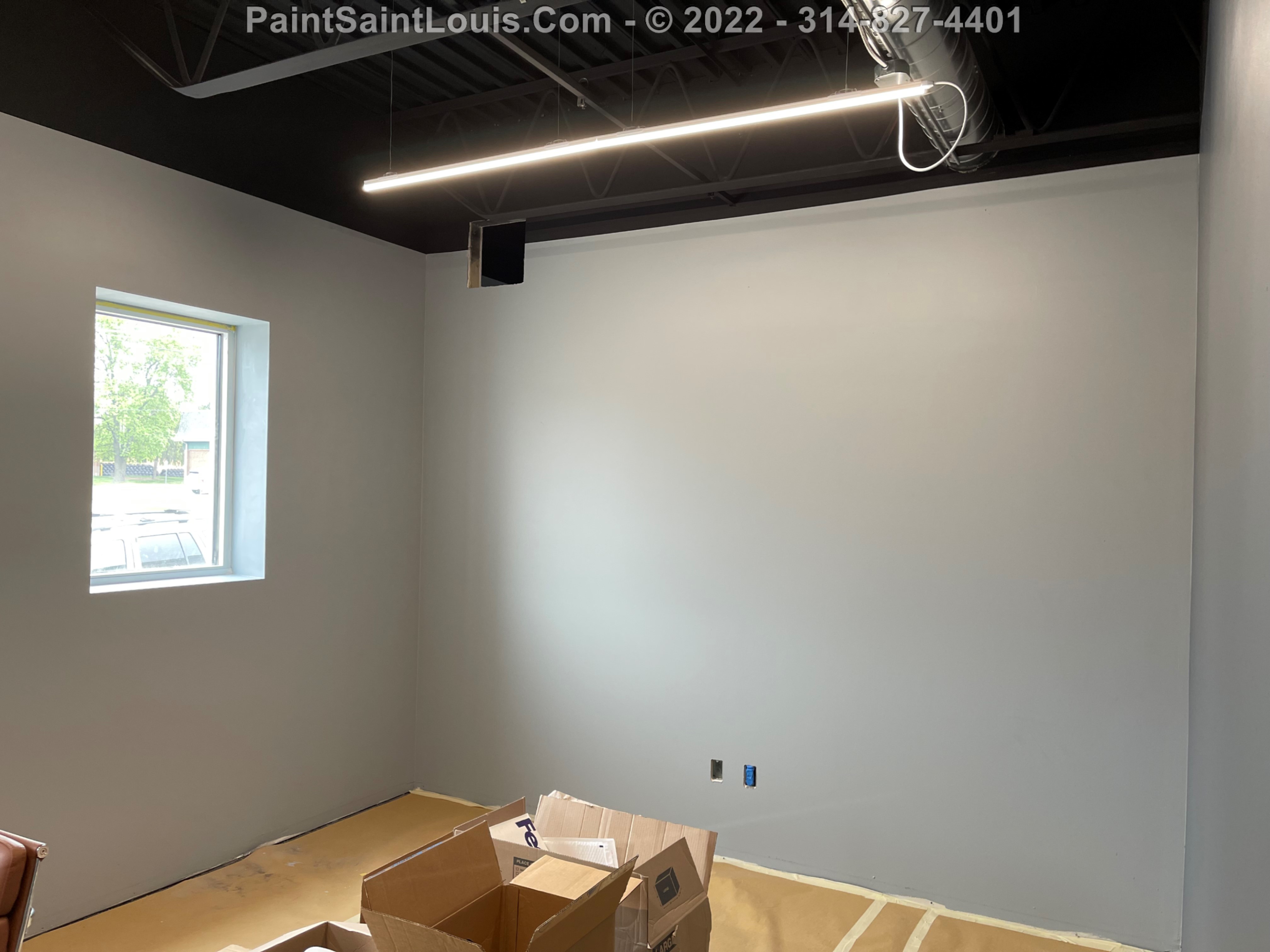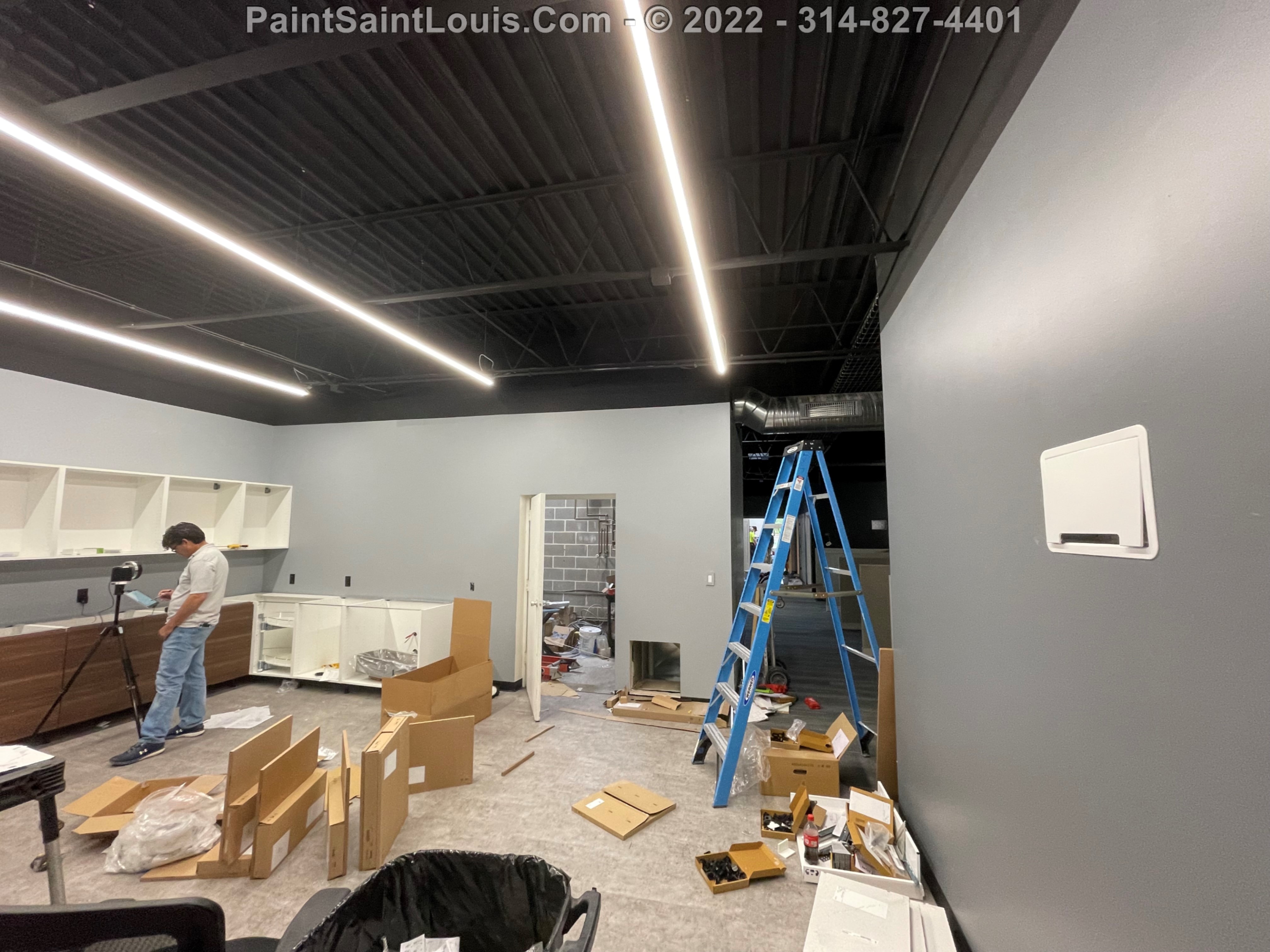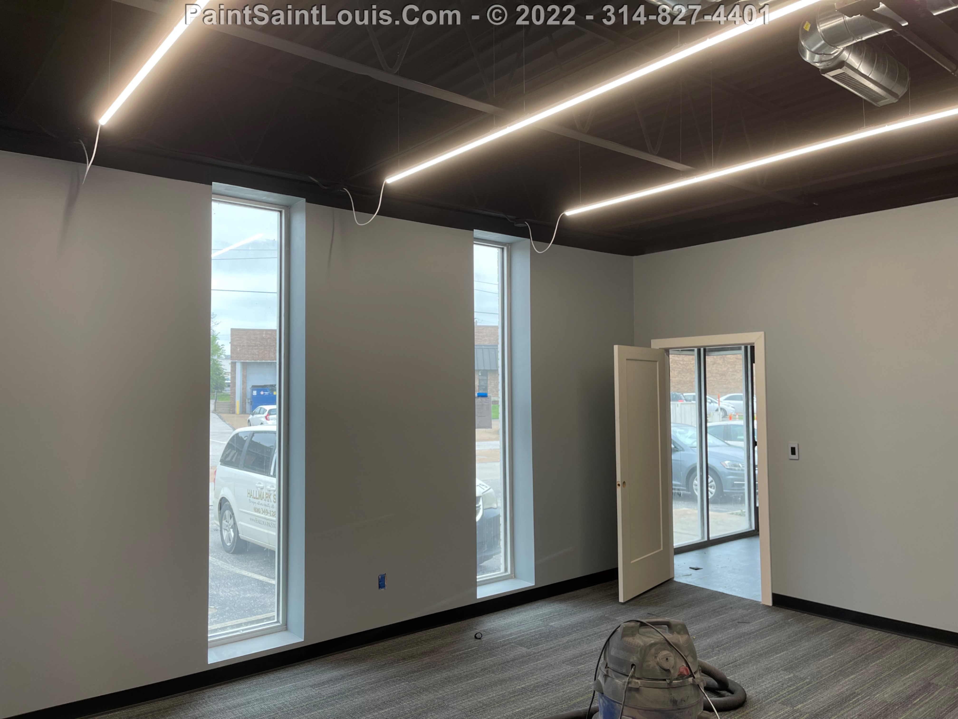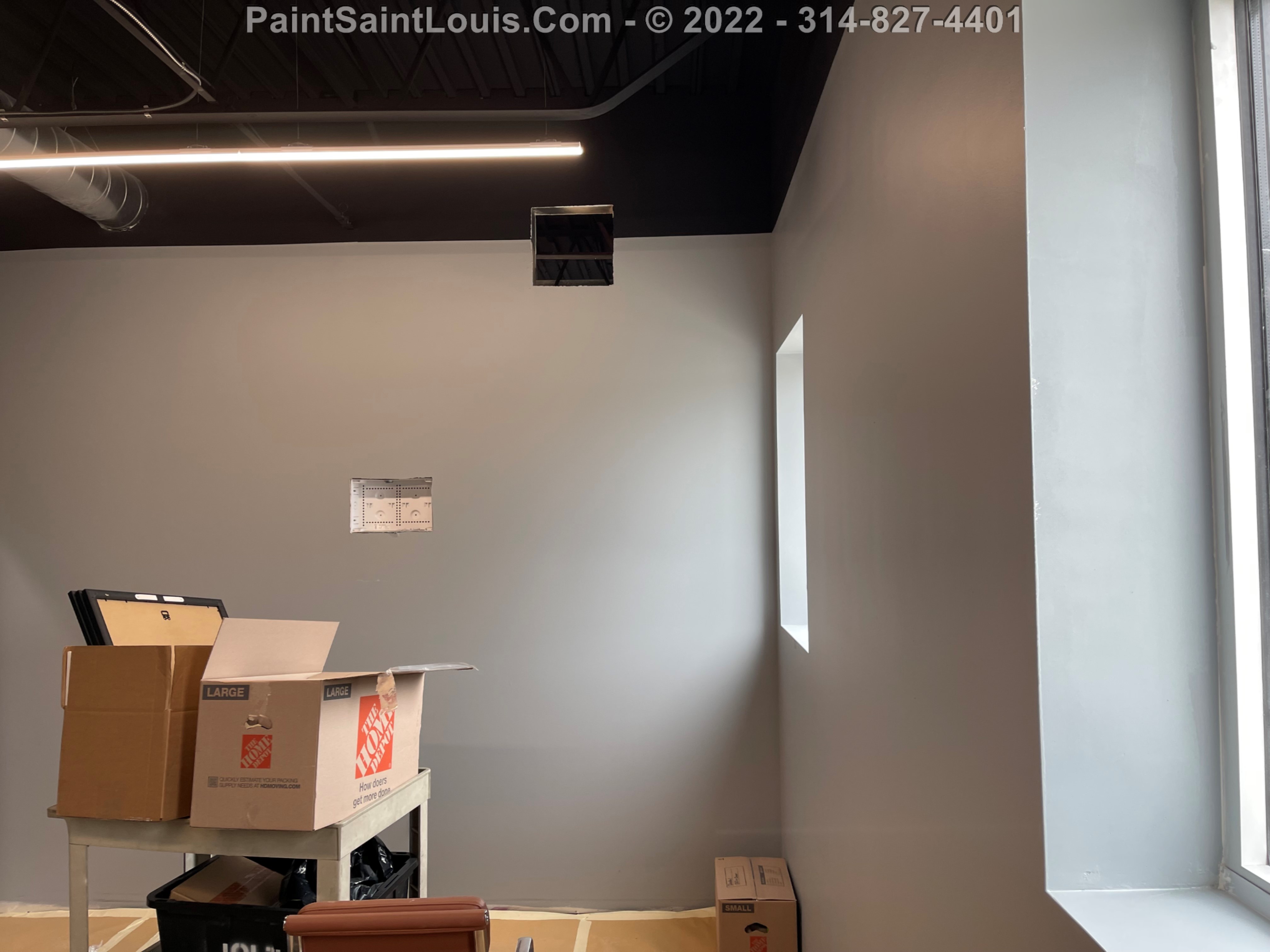 A whole lot of work in a short amount of time. Because of a time crunch we had about two weeks for this project in Brentwood, MO to completely black out the entire ceiling and rafter areas, create an edge line around the entire building without a level surface and paint accent walls in every single room. And it all had to be primed/sealed first. A challenge but definitely not impossible and in the end another successful painting project with a stunning before and after look.