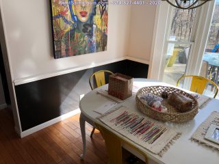 Wall color is Sherwin’s Eider White and the black accent in the dining room and kitchen along with the stair risers and rails is Tricorn Black.