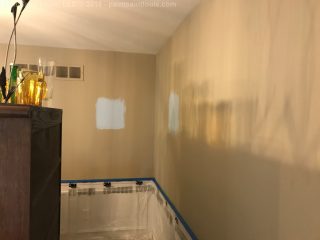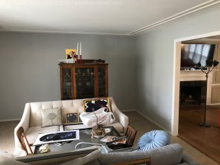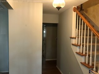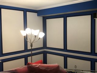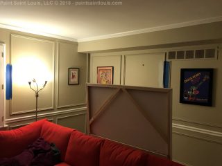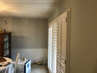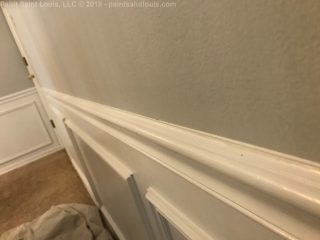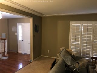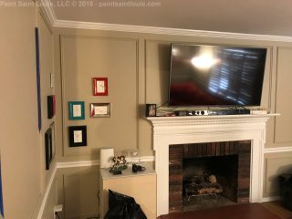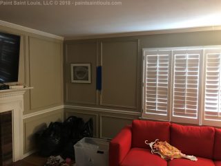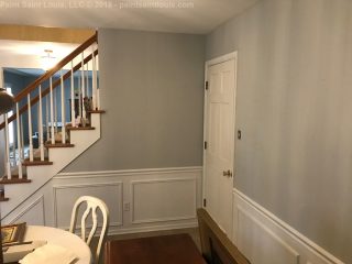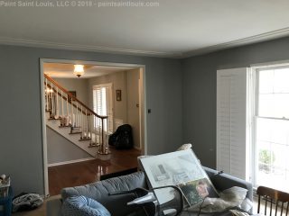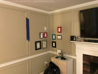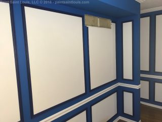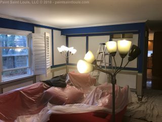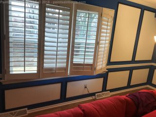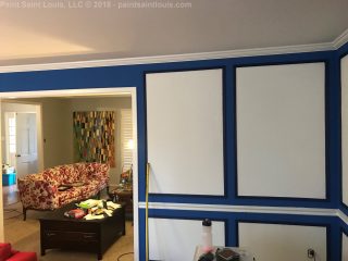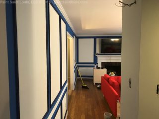 For this round we came to his new home and did the top side walls of the dining room (wainscot below was not painted), the entry foyer and the family room and then since time permitted added in the living room. The entire front of the house was done in the same color as was the inner hall. The living room however went bold. Since the walls were wainscot top and bottom with a chair rail in the middle customer went white on the crown, chair rail and base/door frames, a medium deep blue and a dark blue on the trim piece itself.