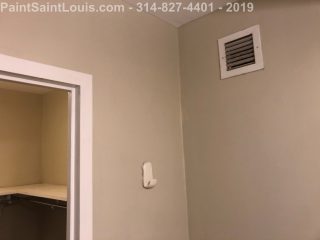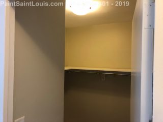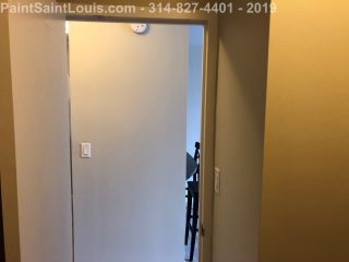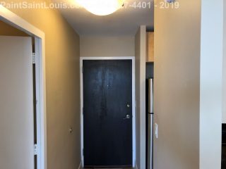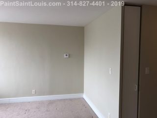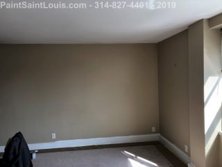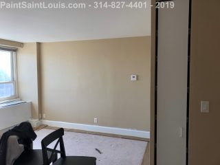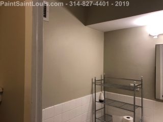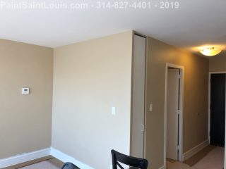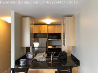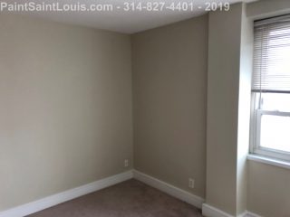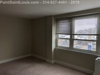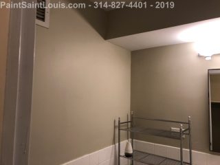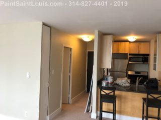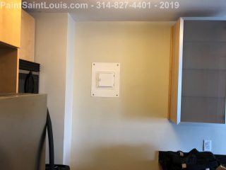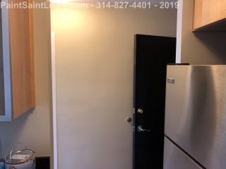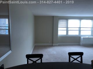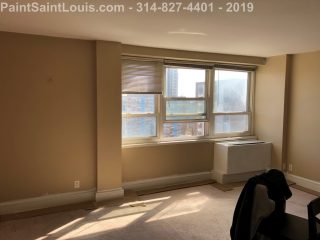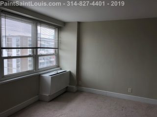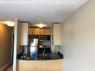 Repaint of a downtown studio apartment in the Blu Spaces high rise condo. Repainted one coat ceilings except for a small area that had what appeared to be candle soot, one coat semi gloss white on trip and two coats of Promar 200 Zero VOC in low sheen eggshell in the main area, kitchen, closet and bathroom.