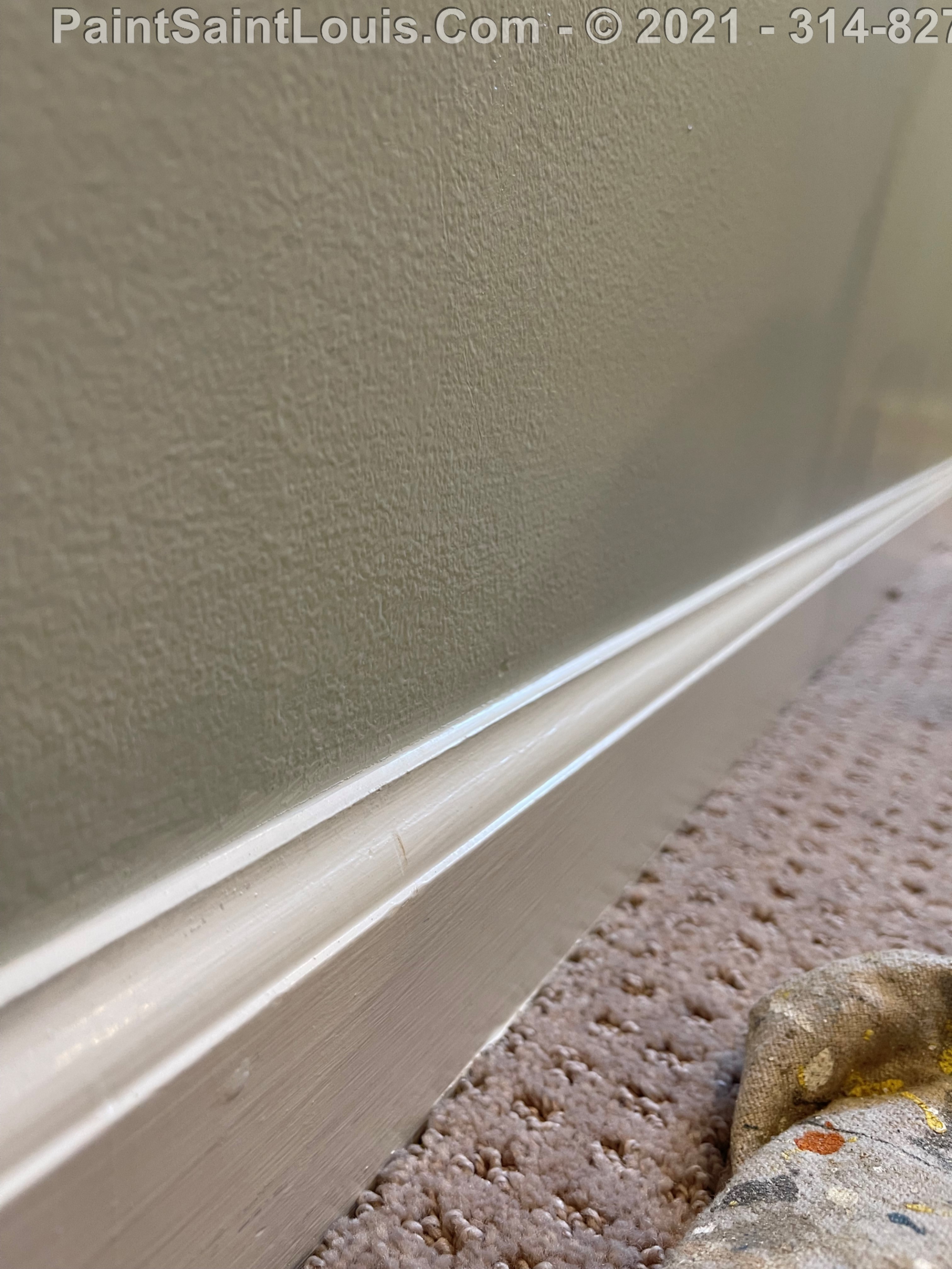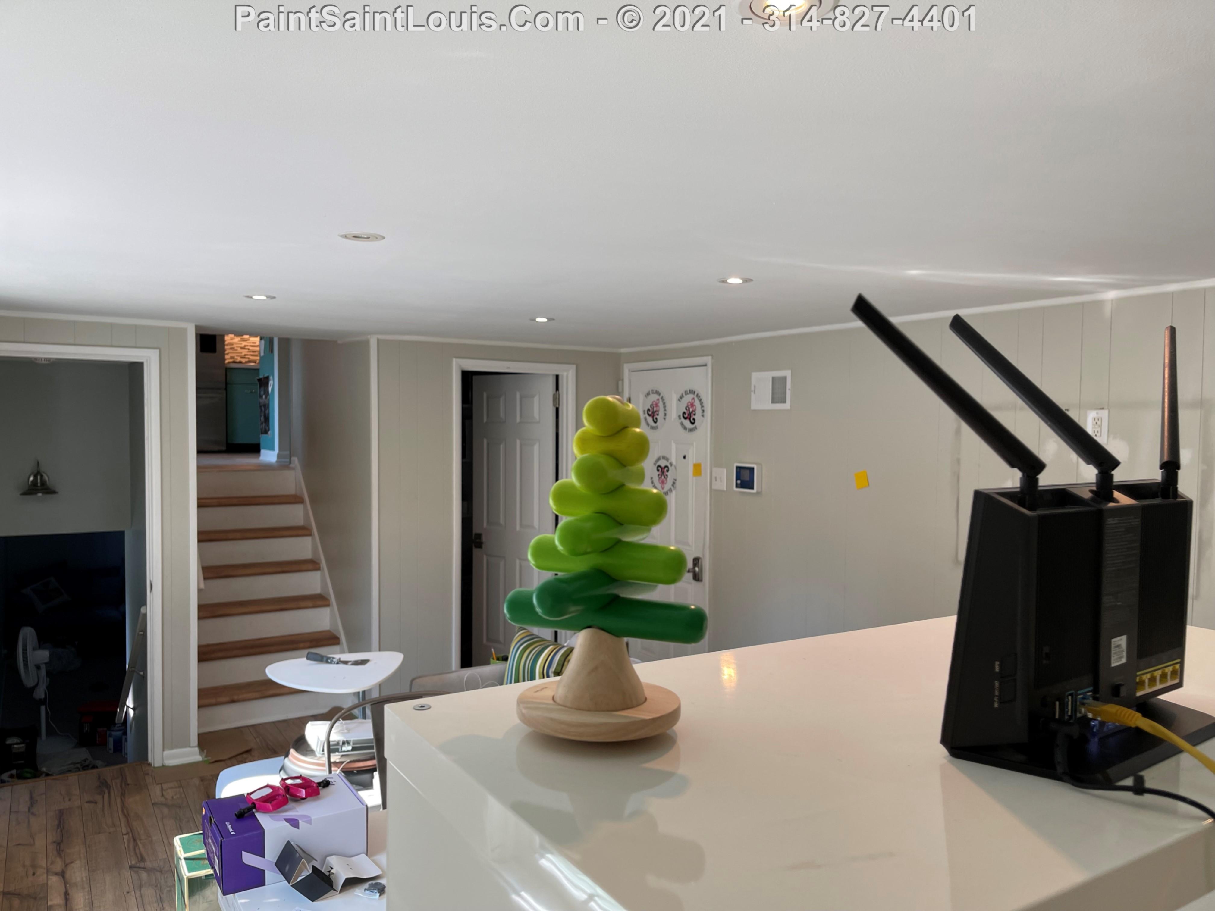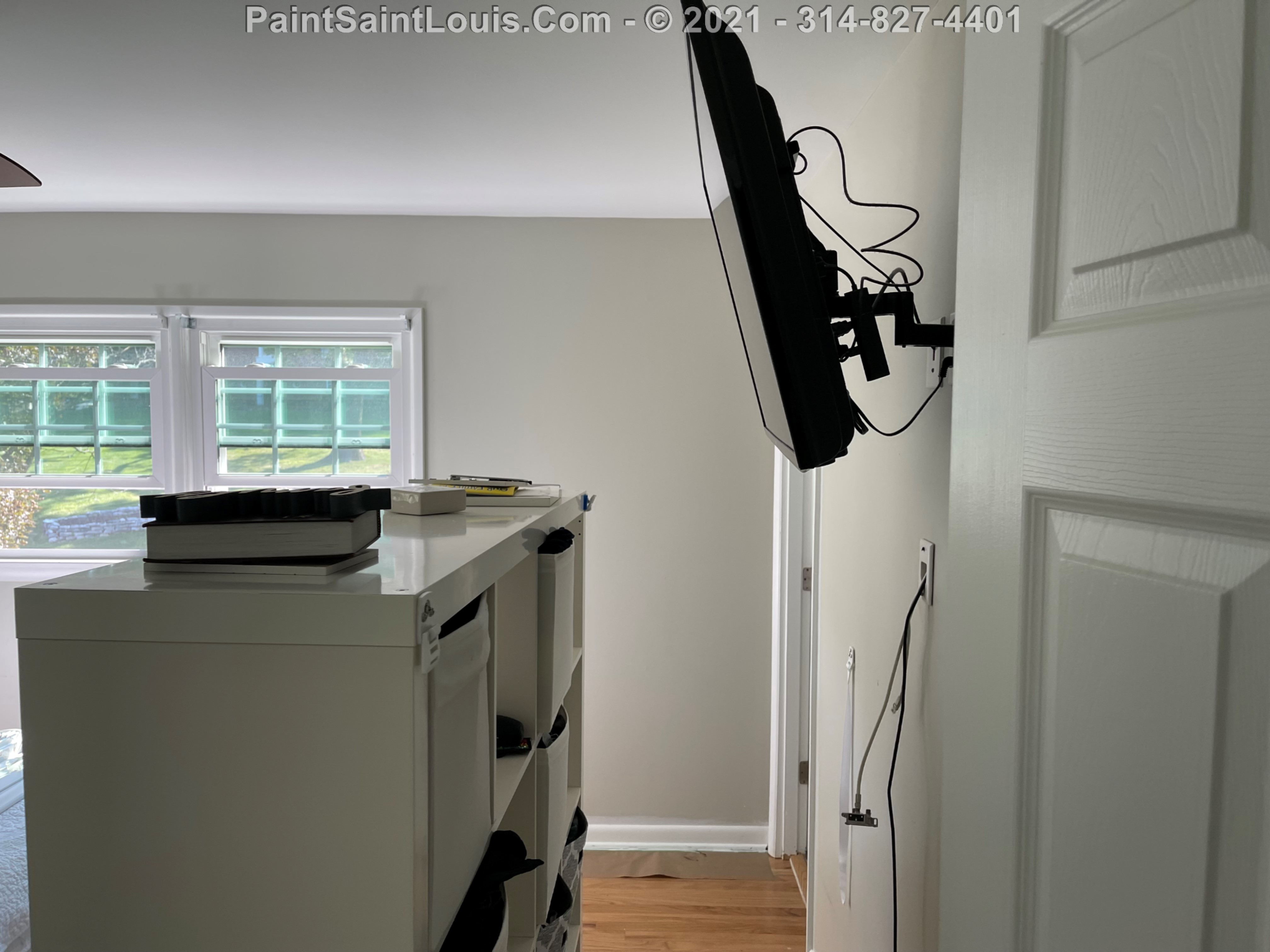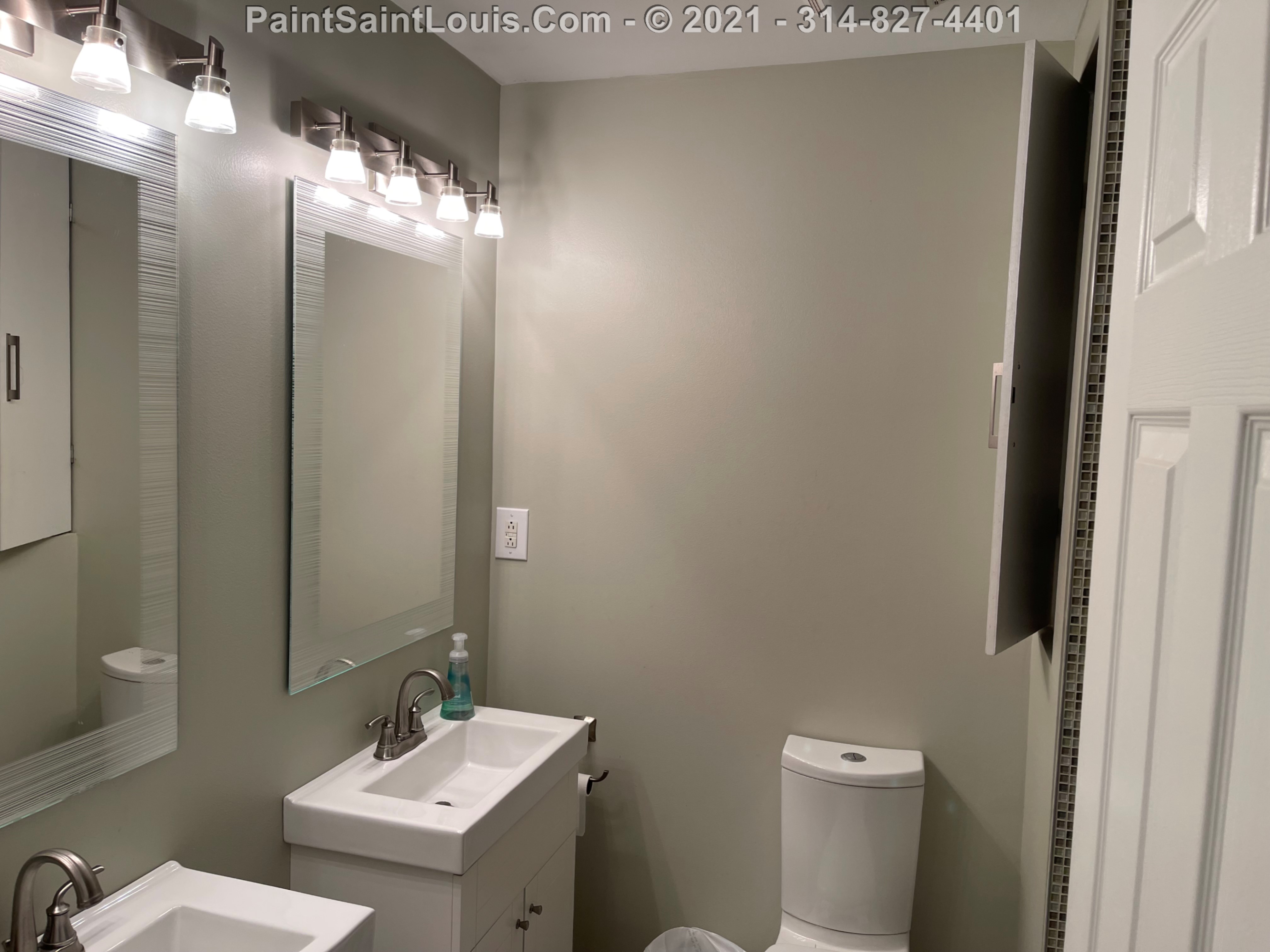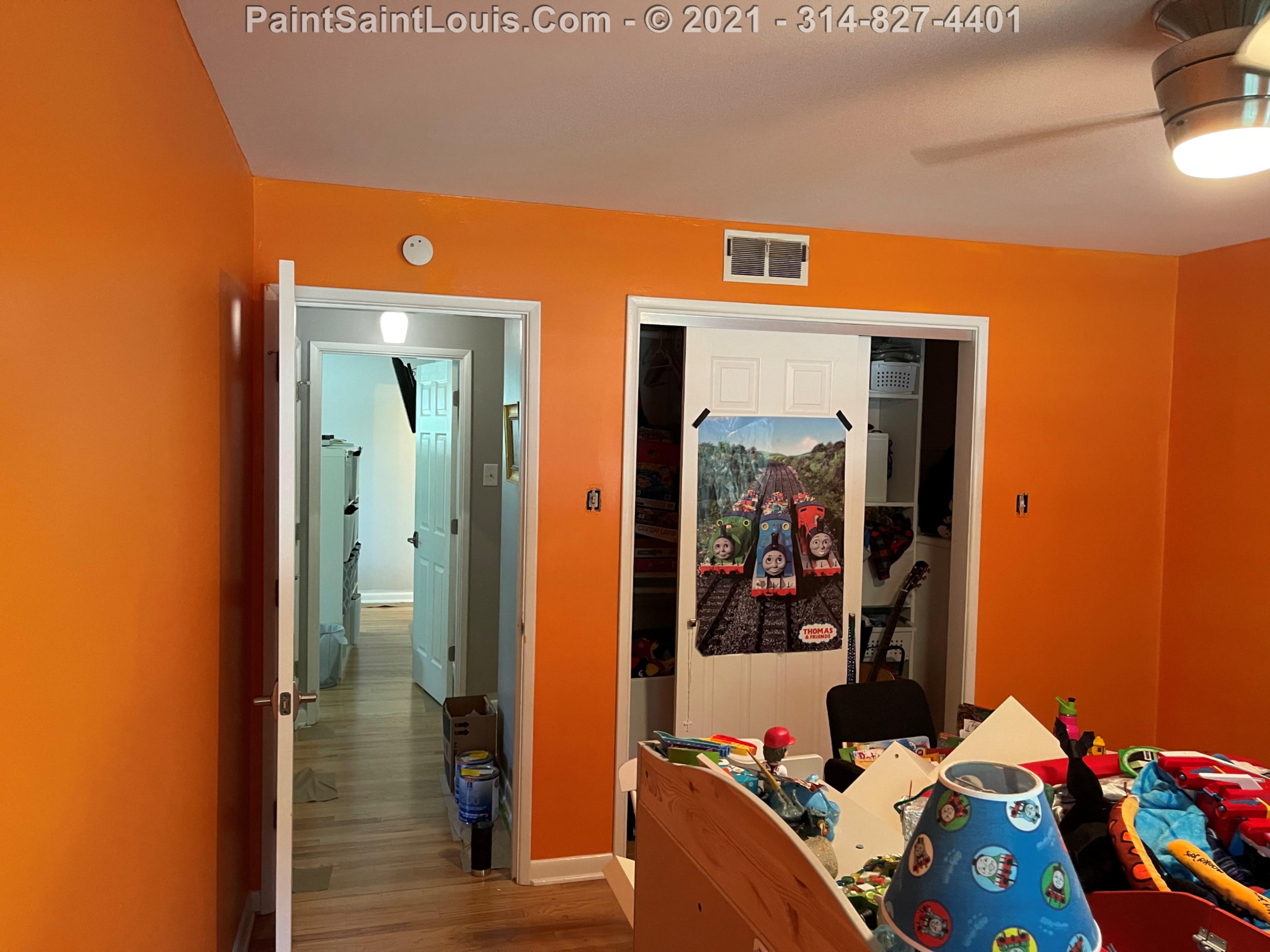 Customer had us come in and do a baseboard and wall repaint of the vast majority of this Kirkwood home. Most was a fairly matched wall color except for the accents, white in kitchen and orange in a secondary bedroom. The ceiling in the basement ‘office’ was also painted. In total this included the master bed, master bath, secondary bedroom, upper hall, hall bath, main living area, kitchen, office and basement family room. There were also a few areas of trim painted white and some white trim painted a darker color.