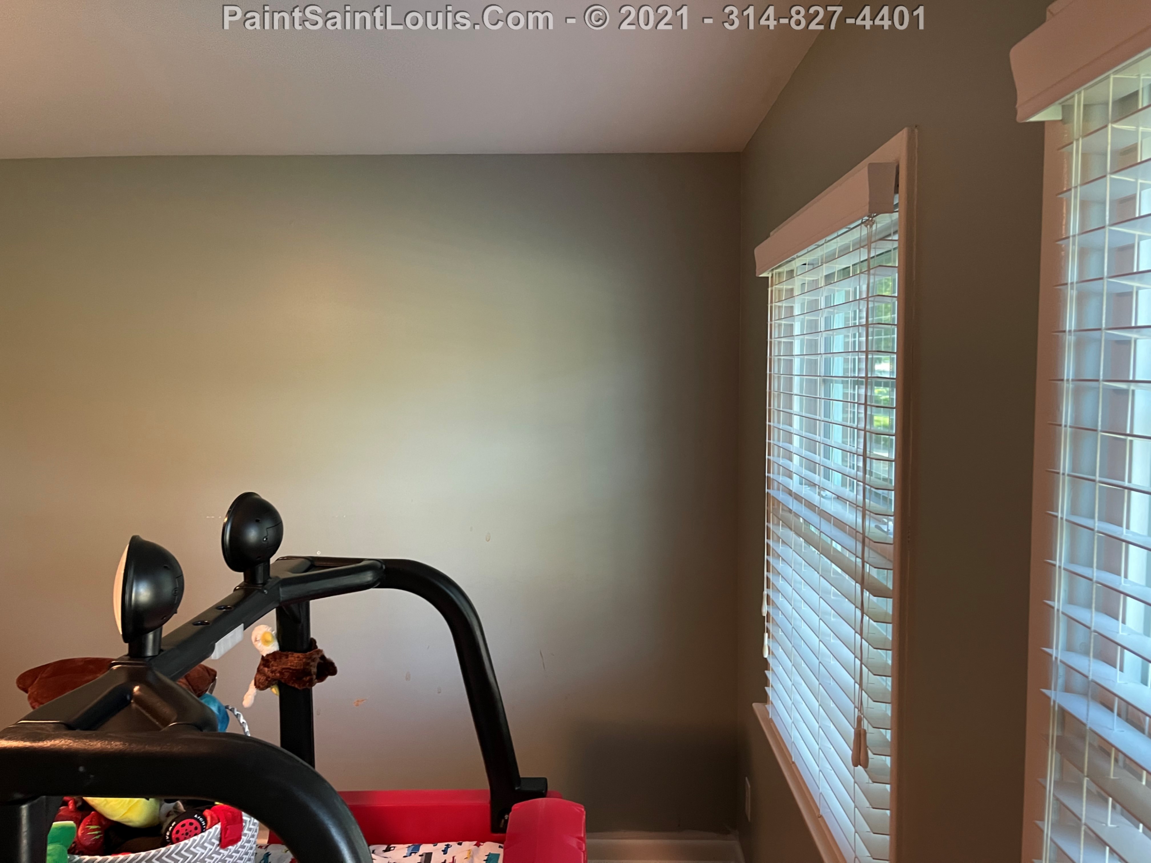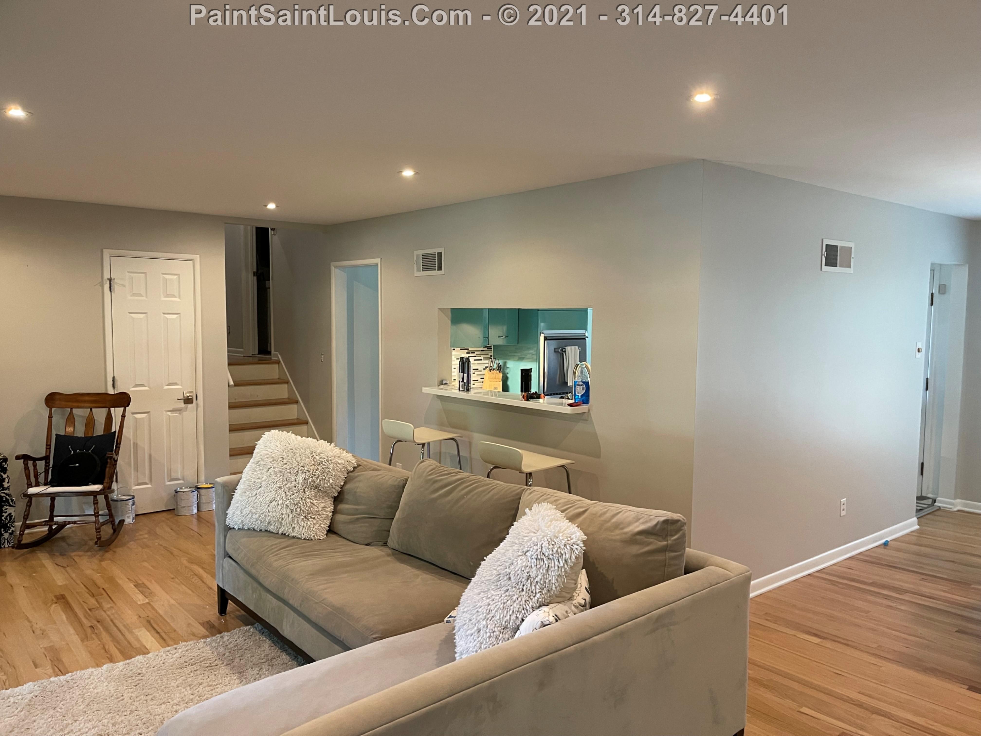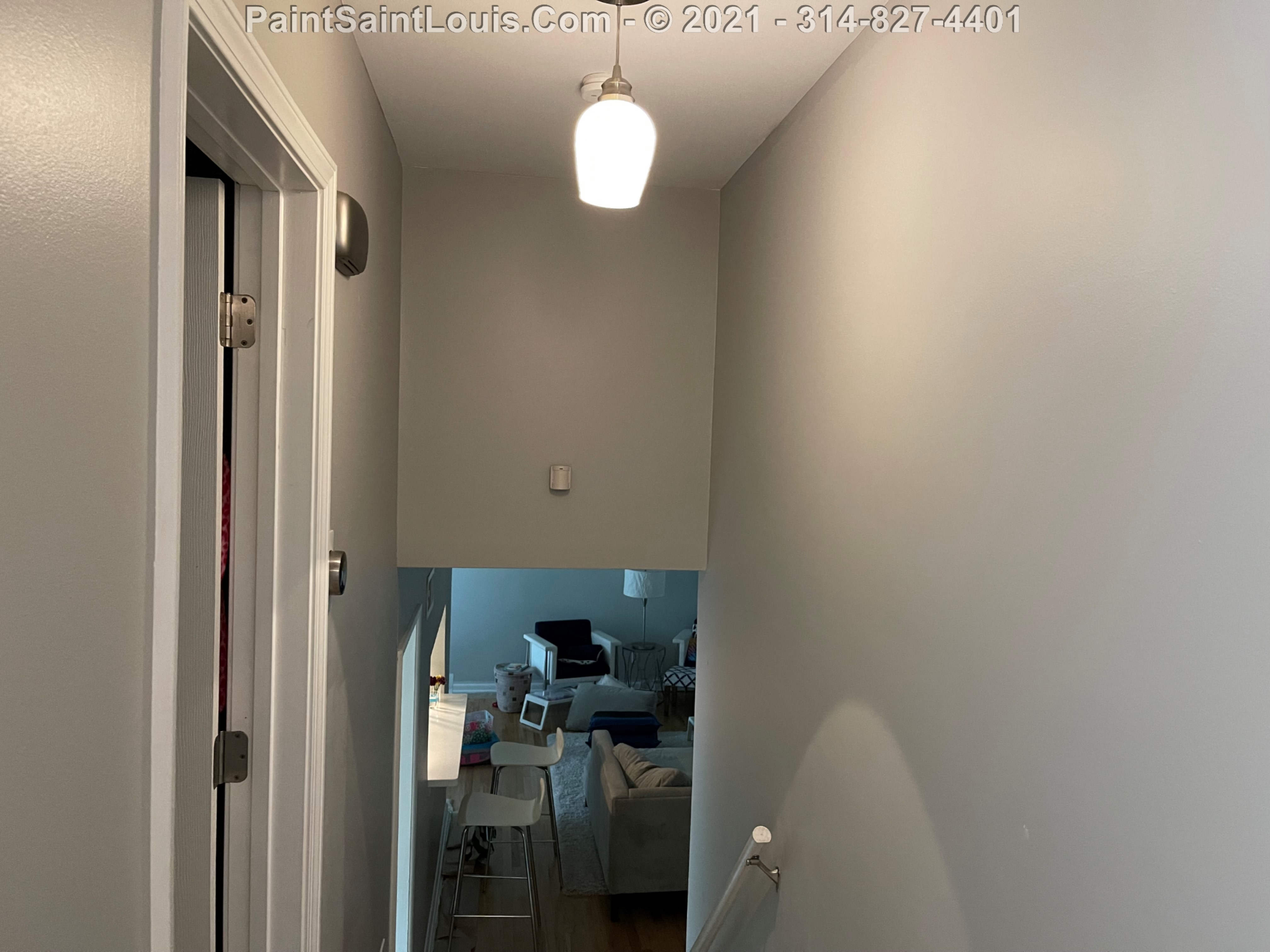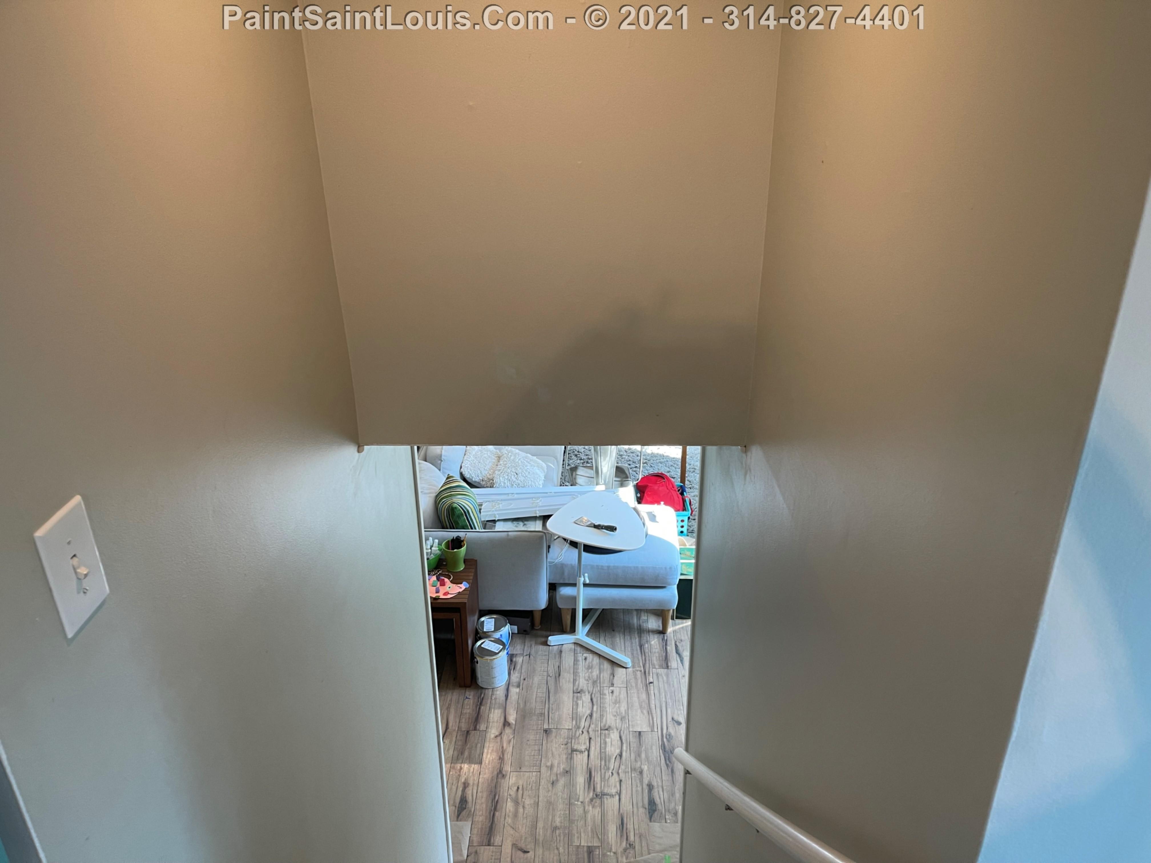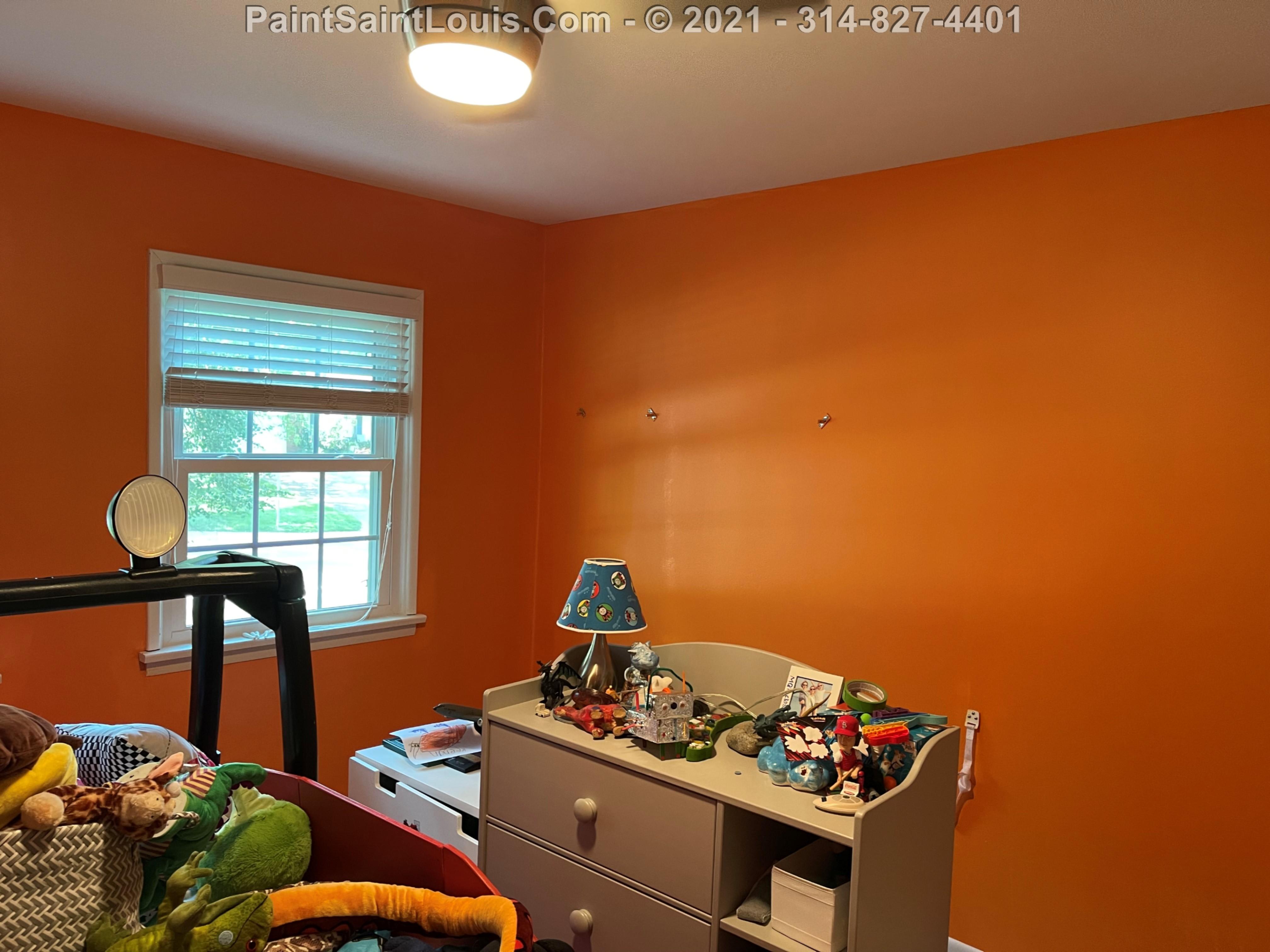 Customer had us come in and do a baseboard and wall repaint of the vast majority of this Kirkwood home. Most was a fairly matched wall color except for the accents, white in kitchen and orange in a secondary bedroom. The ceiling in the basement ‘office’ was also painted. In total this included the master bed, master bath, secondary bedroom, upper hall, hall bath, main living area, kitchen, office and basement family room. There were also a few areas of trim painted white and some white trim painted a darker color.