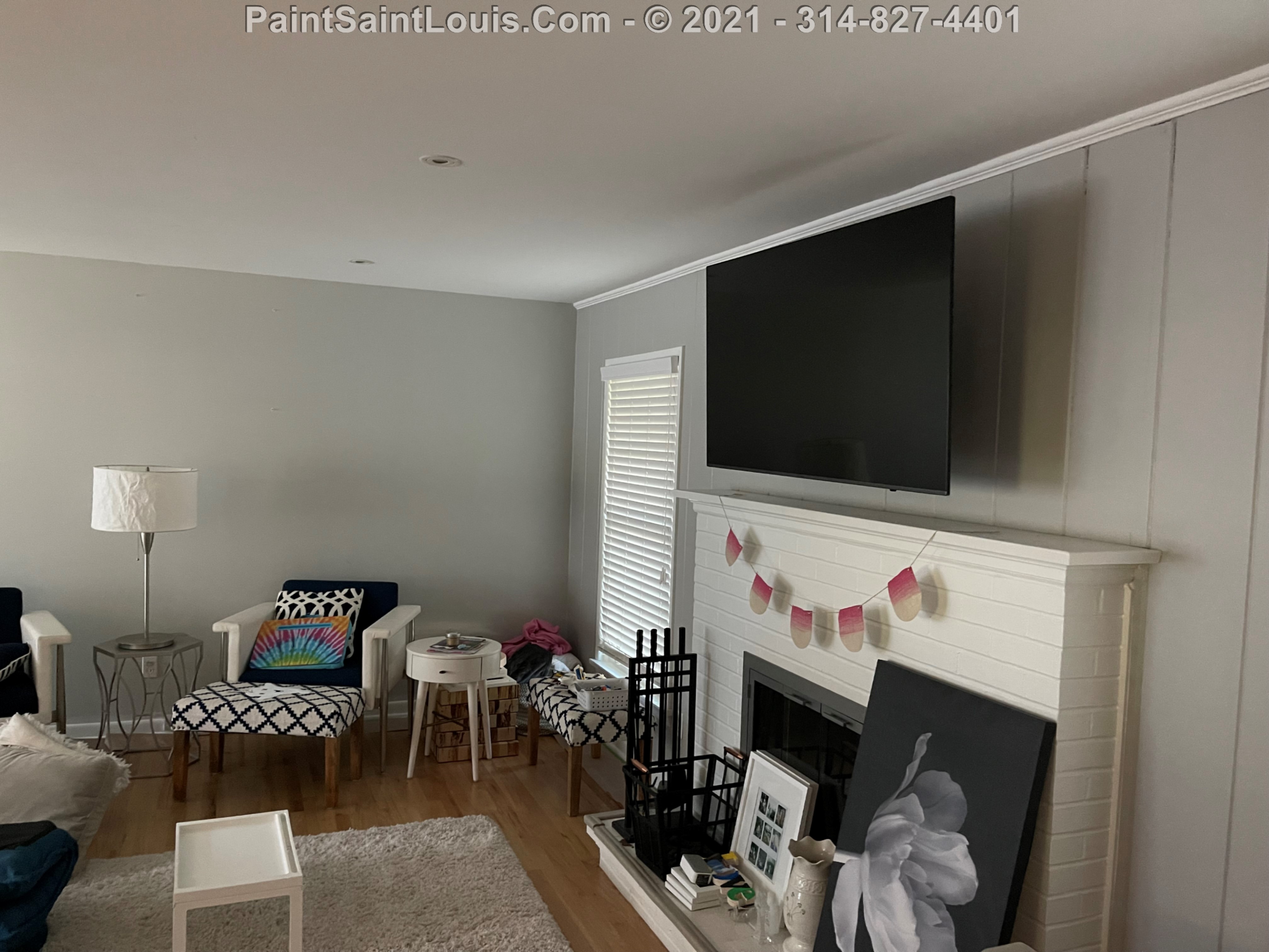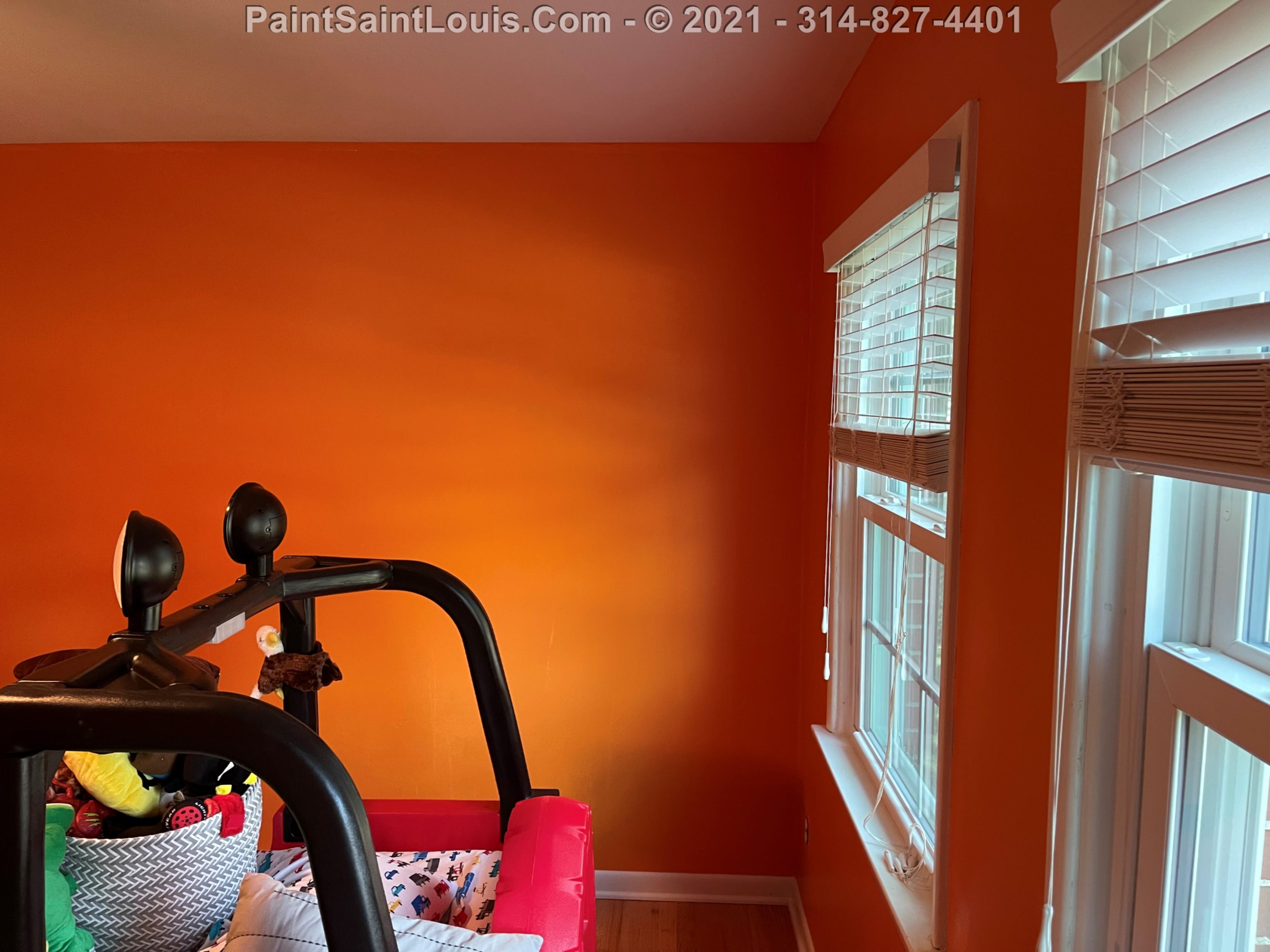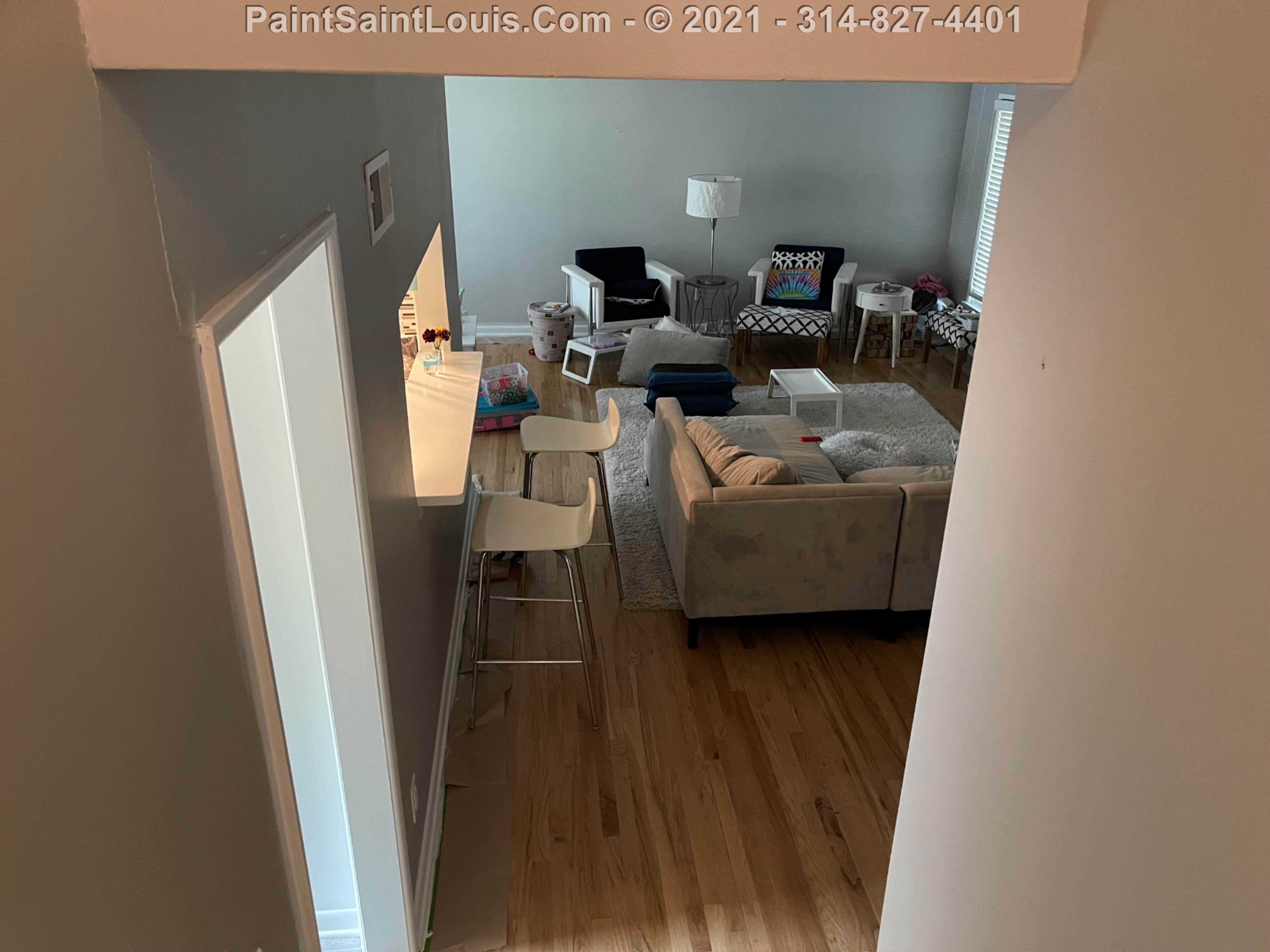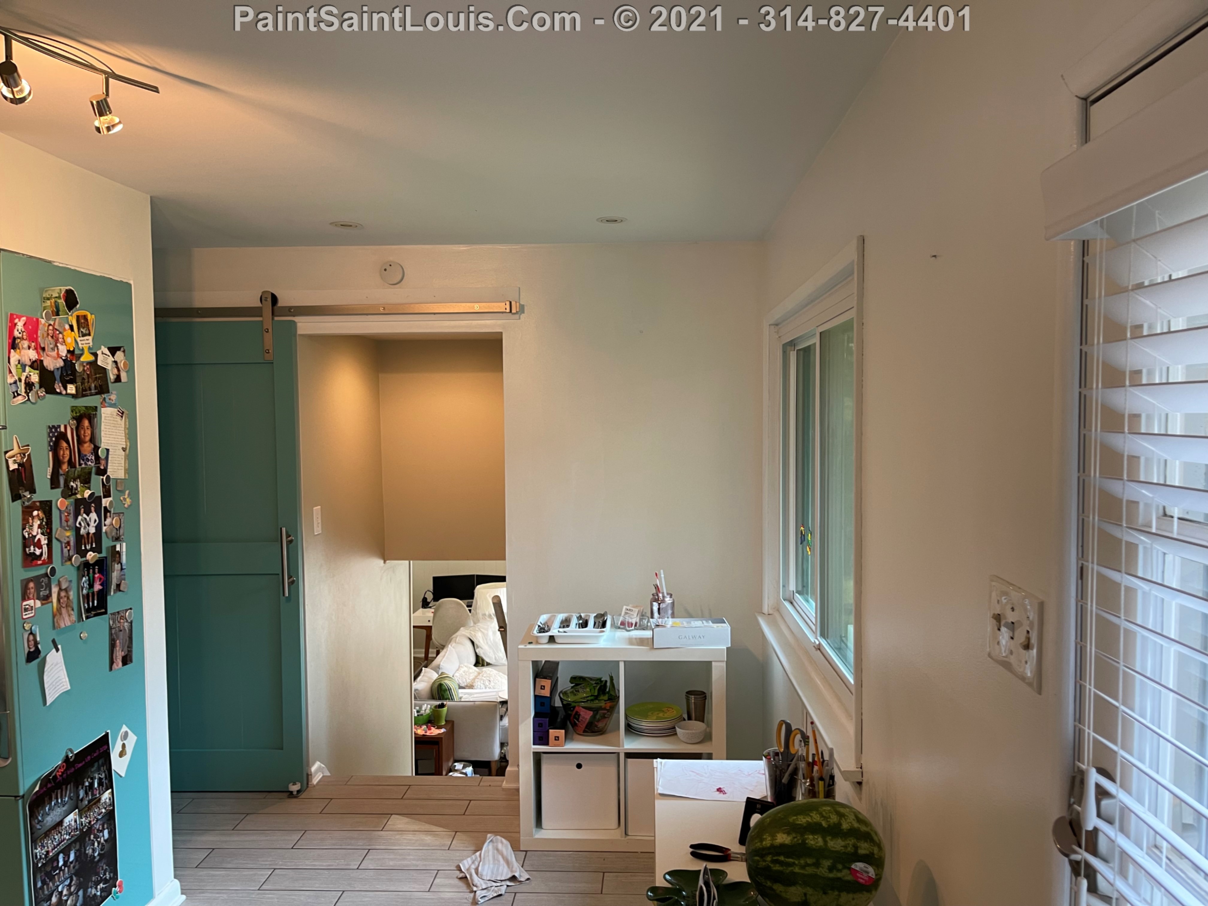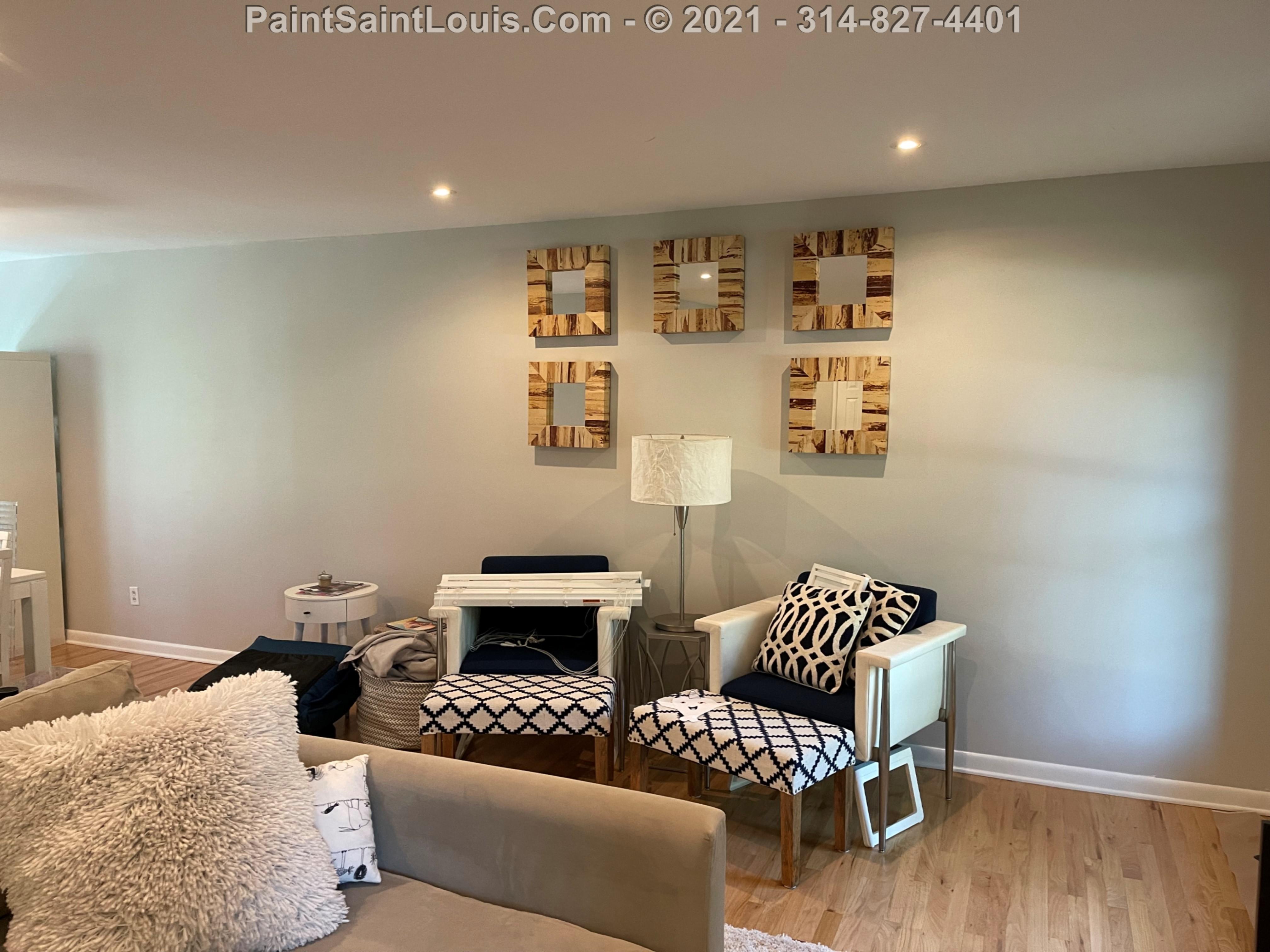 Customer had us come in and do a baseboard and wall repaint of the vast majority of this Kirkwood home. Most was a fairly matched wall color except for the accents, white in kitchen and orange in a secondary bedroom. The ceiling in the basement ‘office’ was also painted. In total this included the master bed, master bath, secondary bedroom, upper hall, hall bath, main living area, kitchen, office and basement family room. There were also a few areas of trim painted white and some white trim painted a darker color.