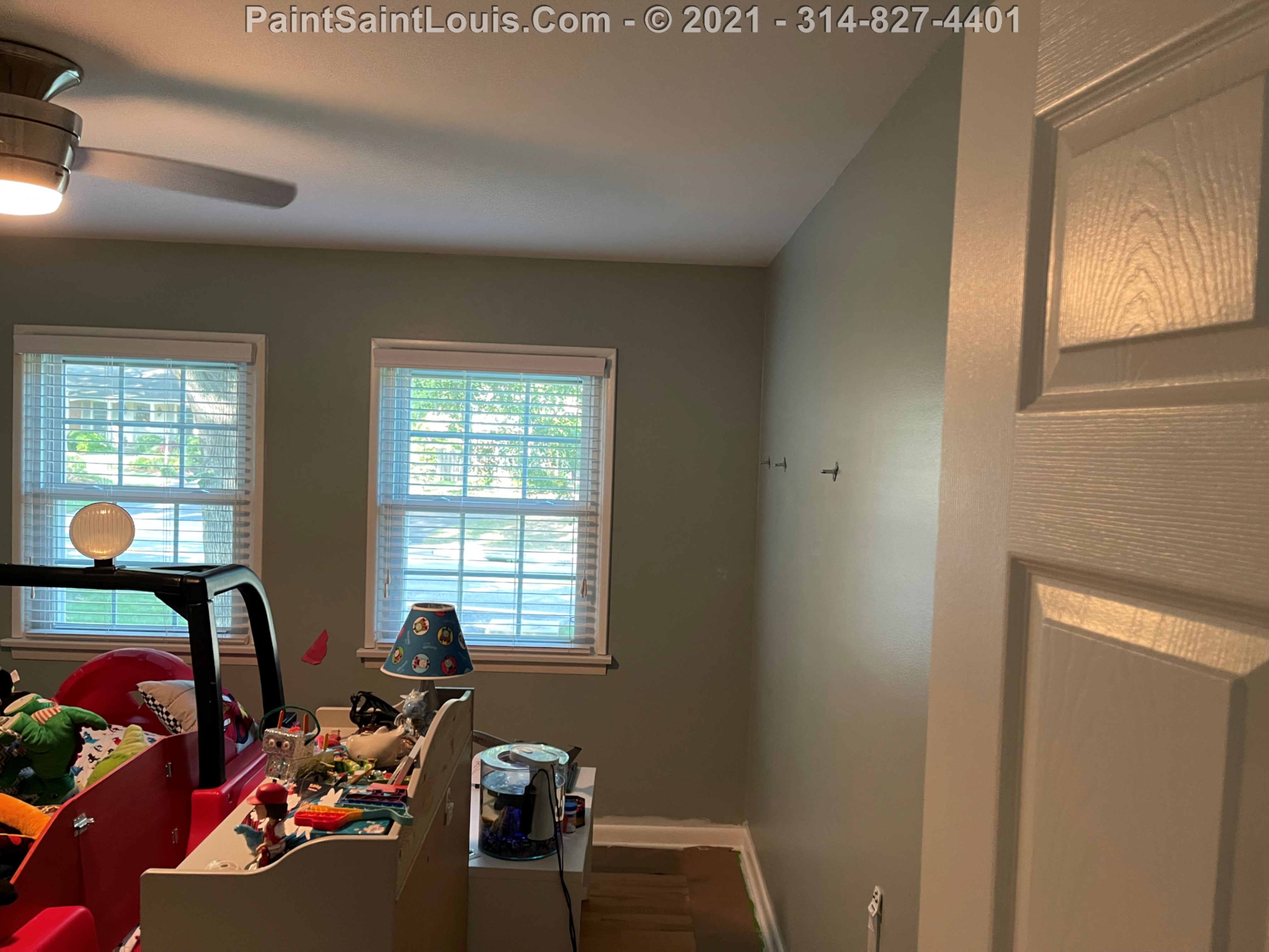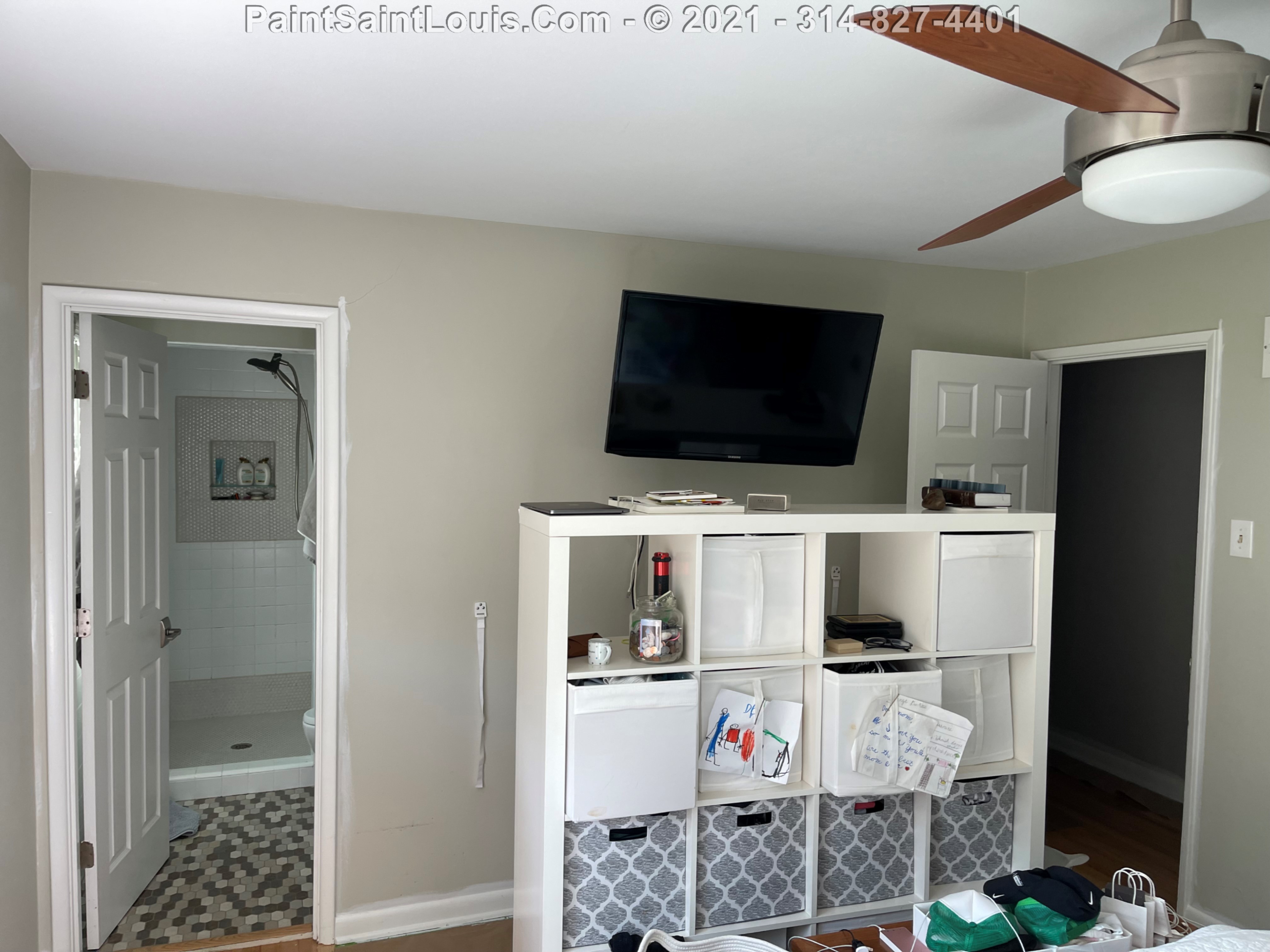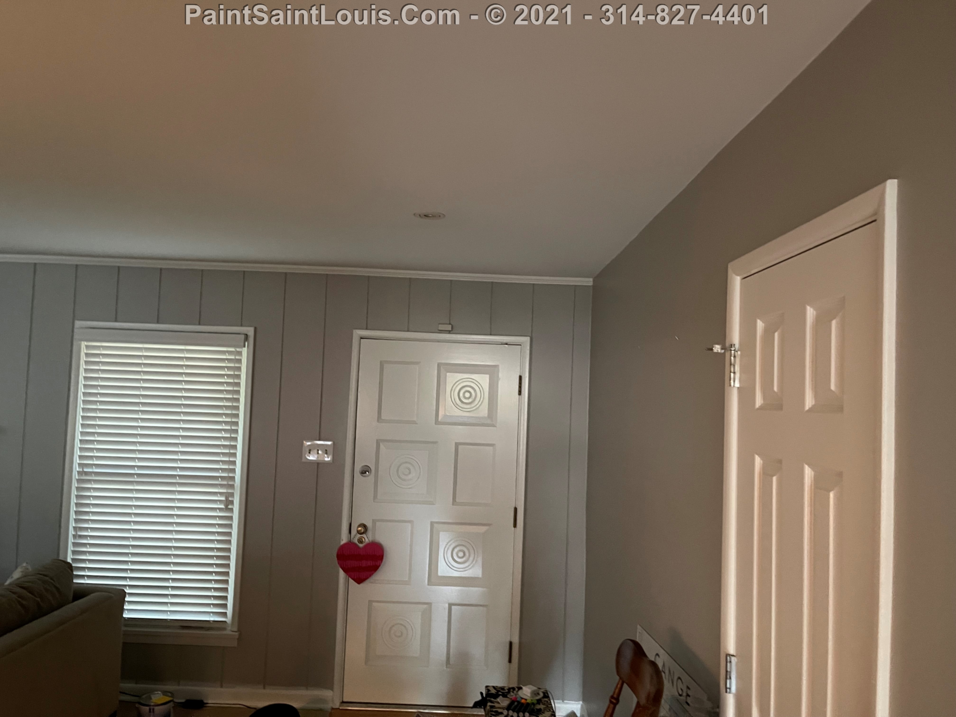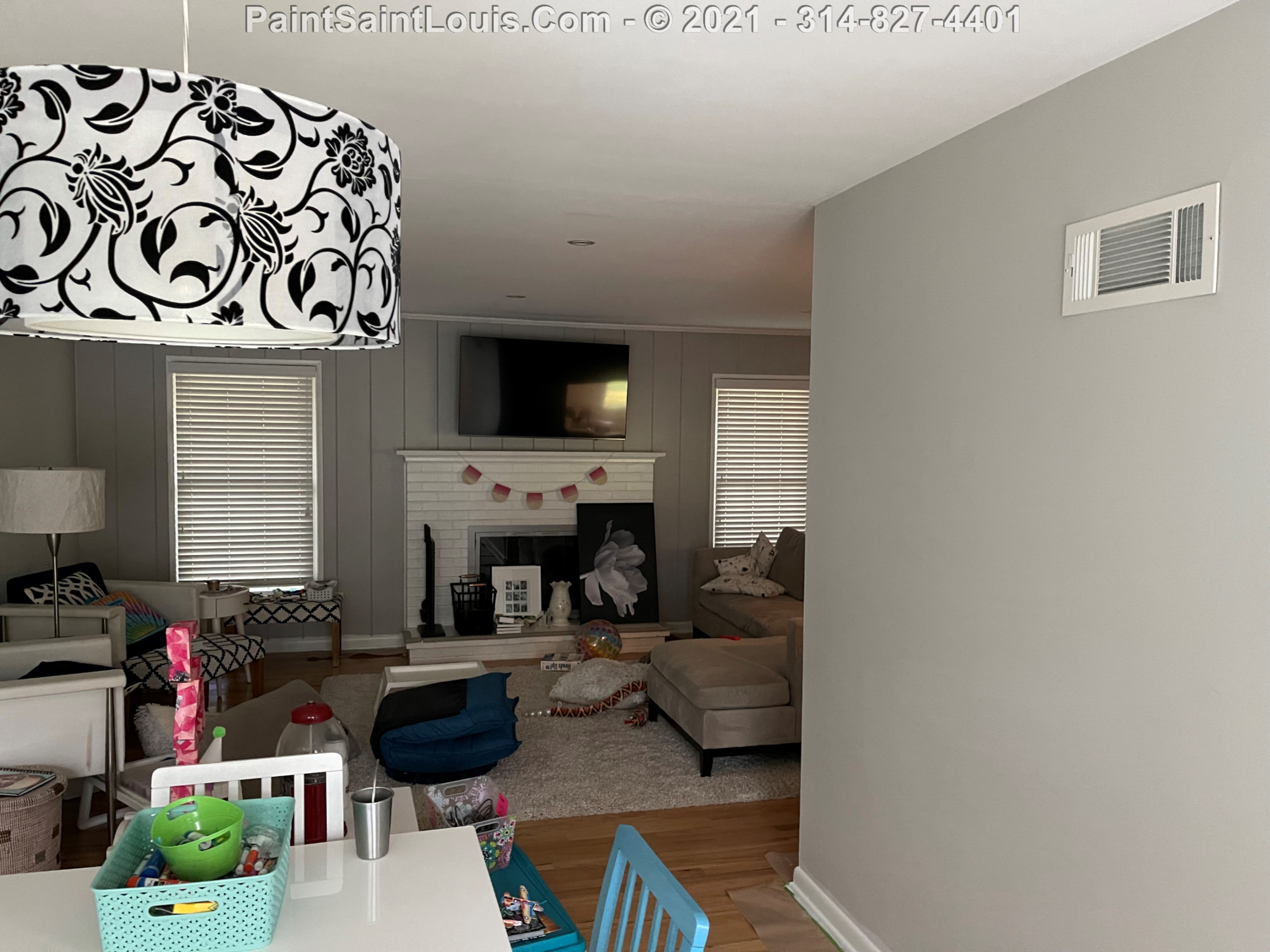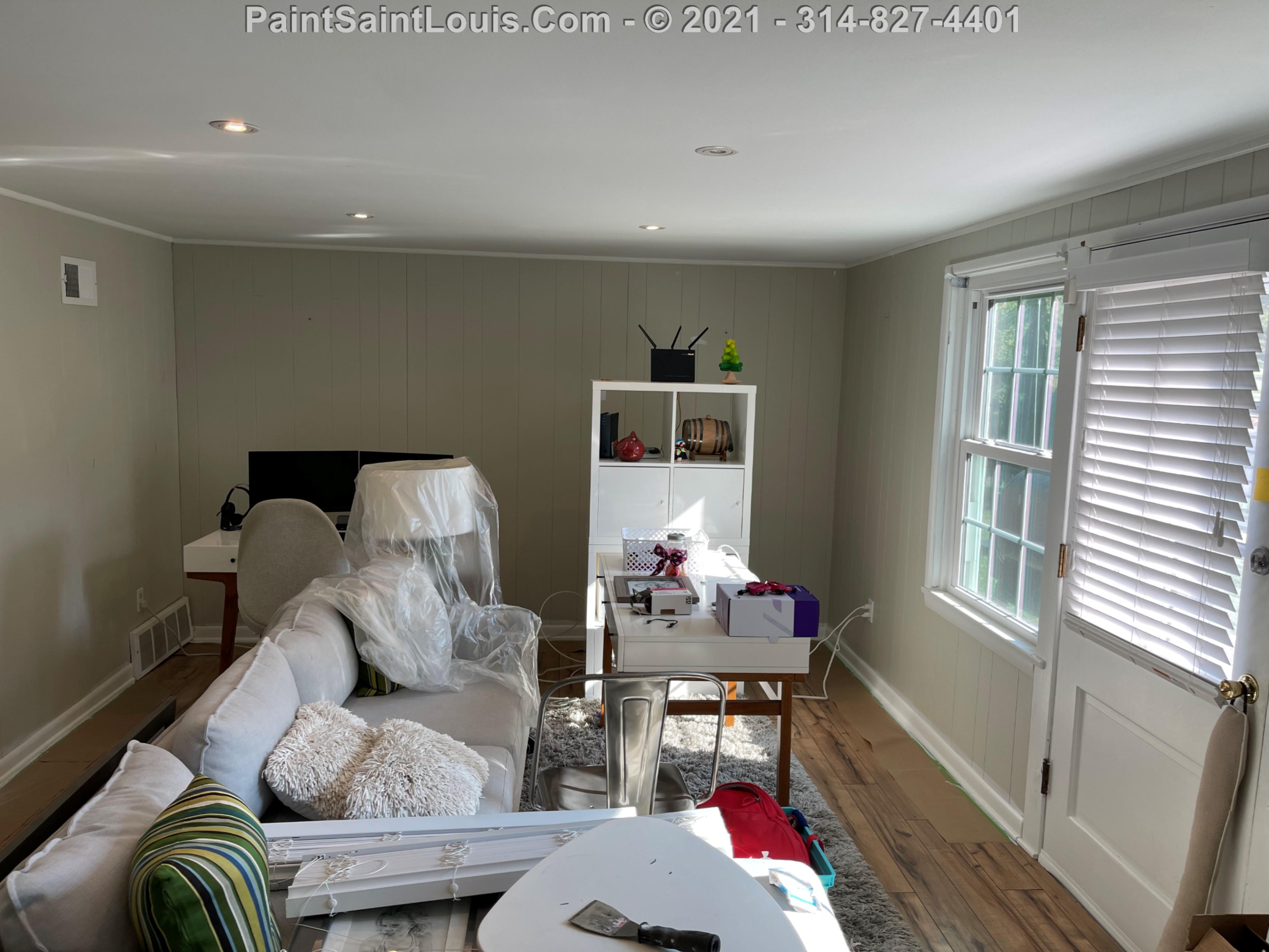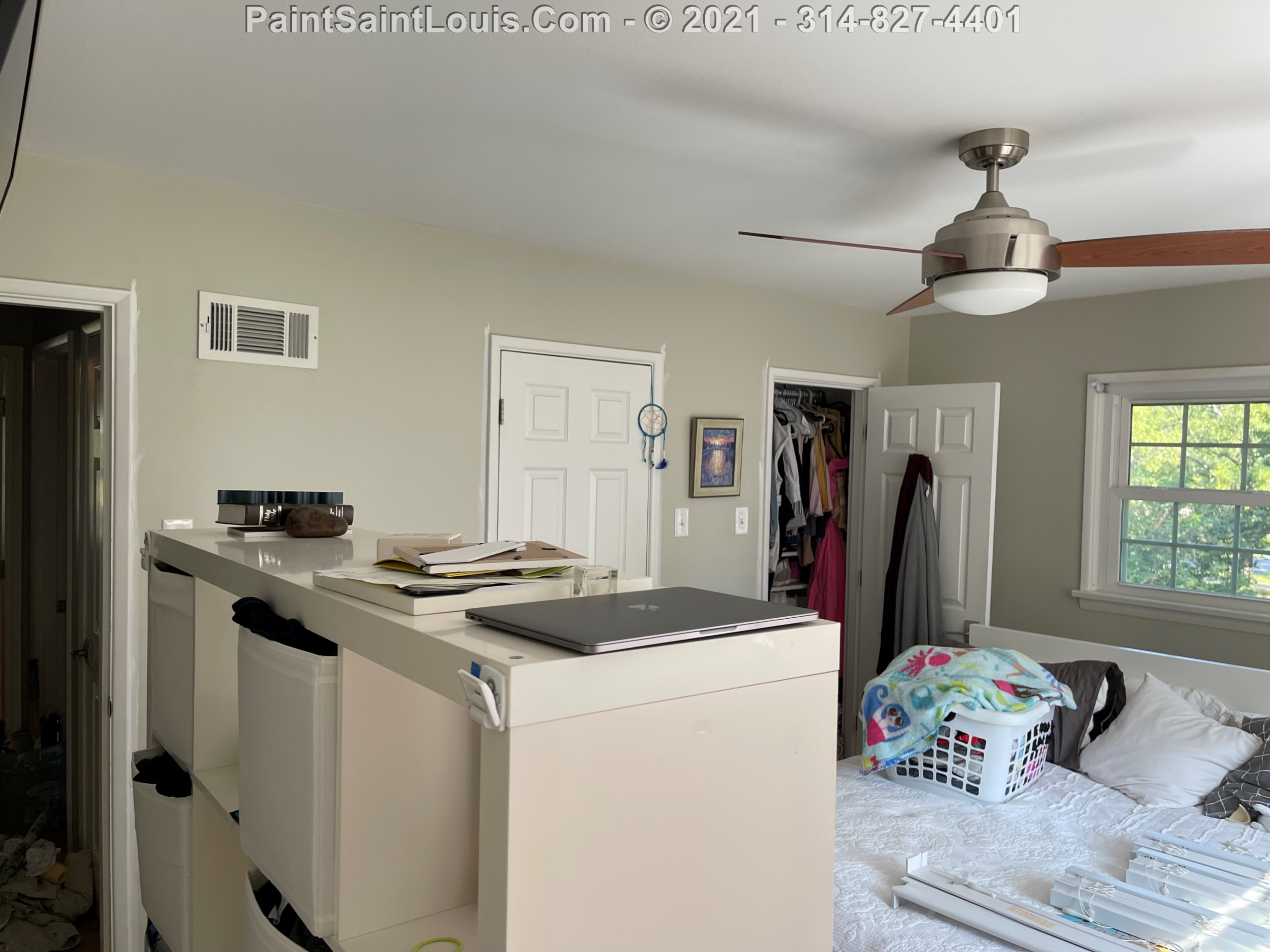 Customer had us come in and do a baseboard and wall repaint of the vast majority of this Kirkwood home. Most was a fairly matched wall color except for the accents, white in kitchen and orange in a secondary bedroom. The ceiling in the basement ‘office’ was also painted. In total this included the master bed, master bath, secondary bedroom, upper hall, hall bath, main living area, kitchen, office and basement family room. There were also a few areas of trim painted white and some white trim painted a darker color.