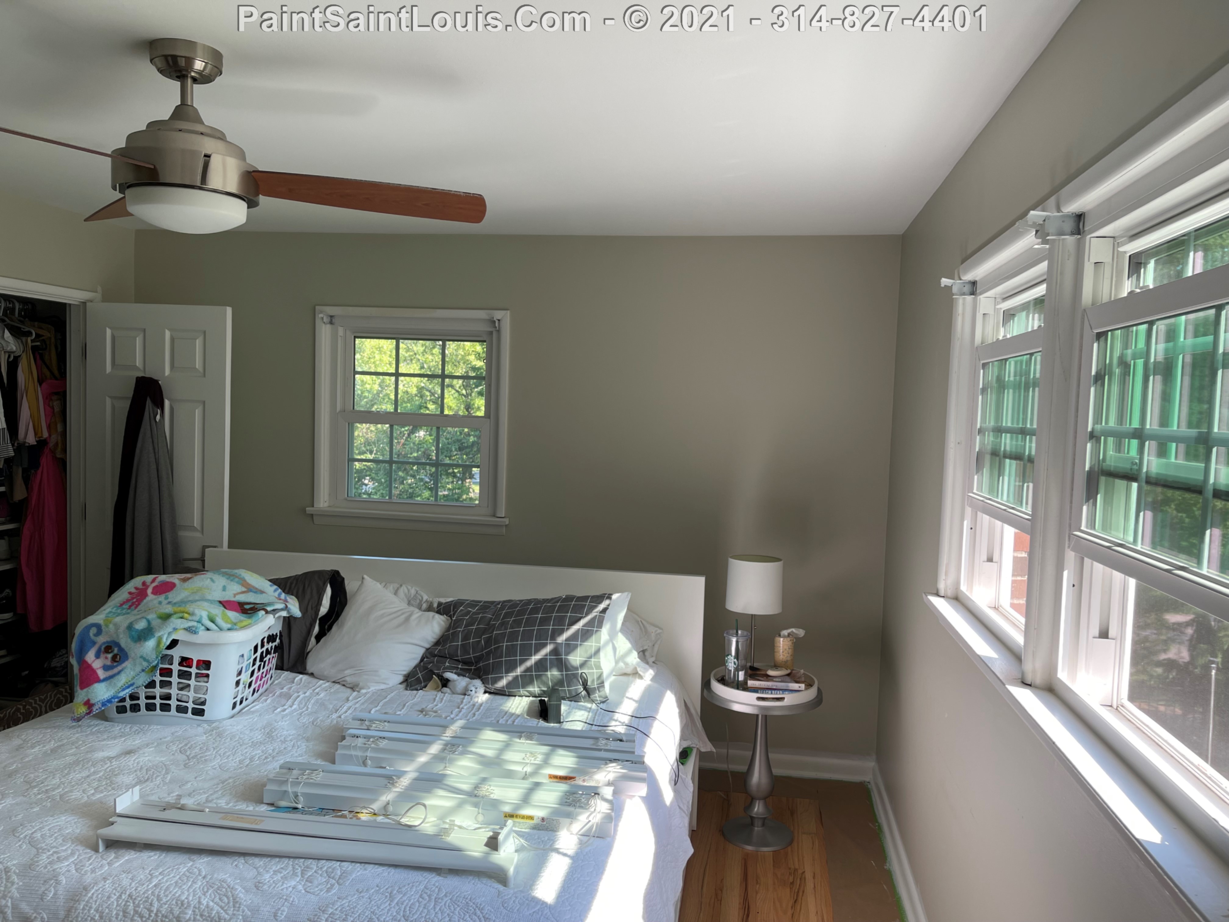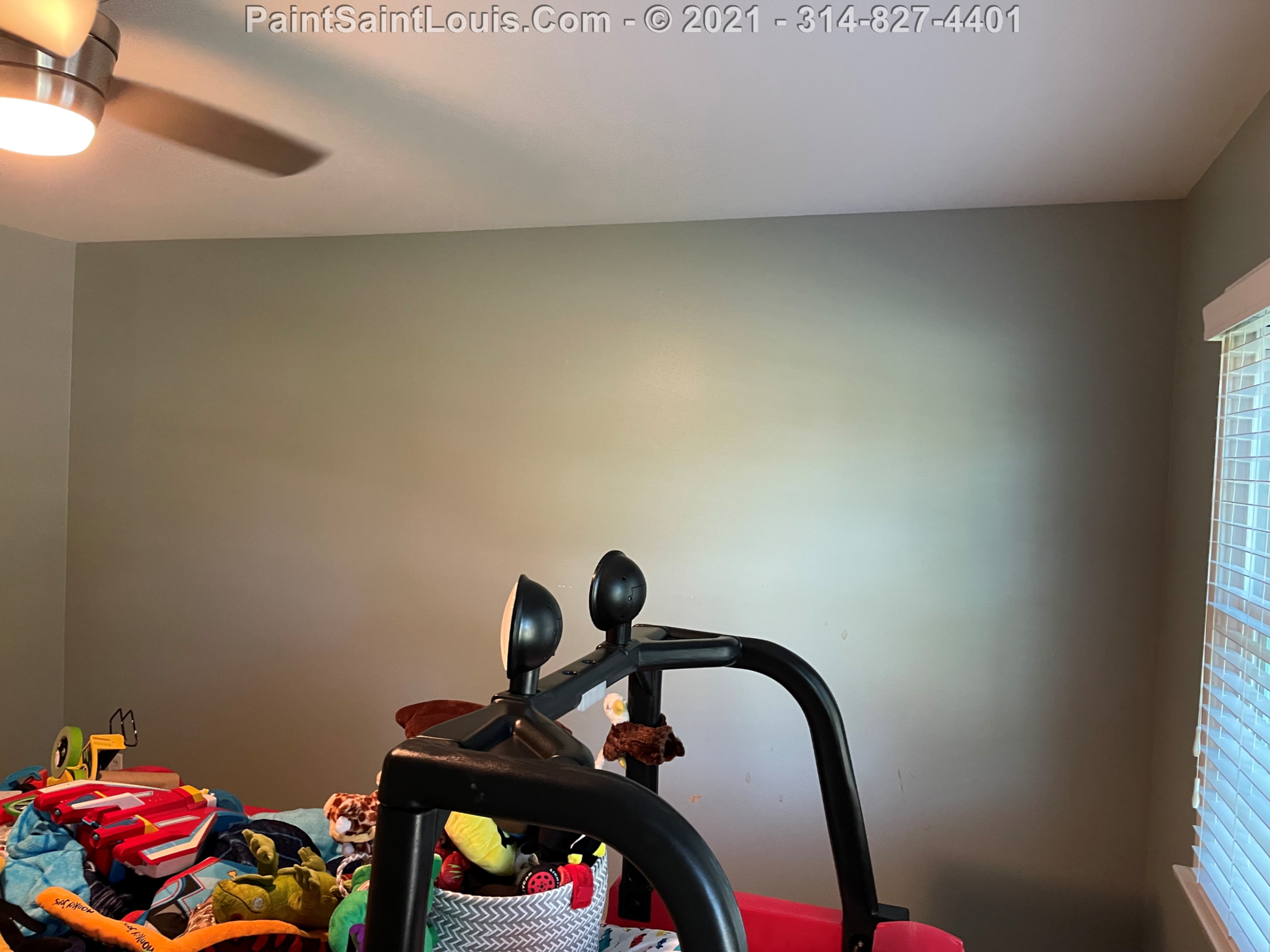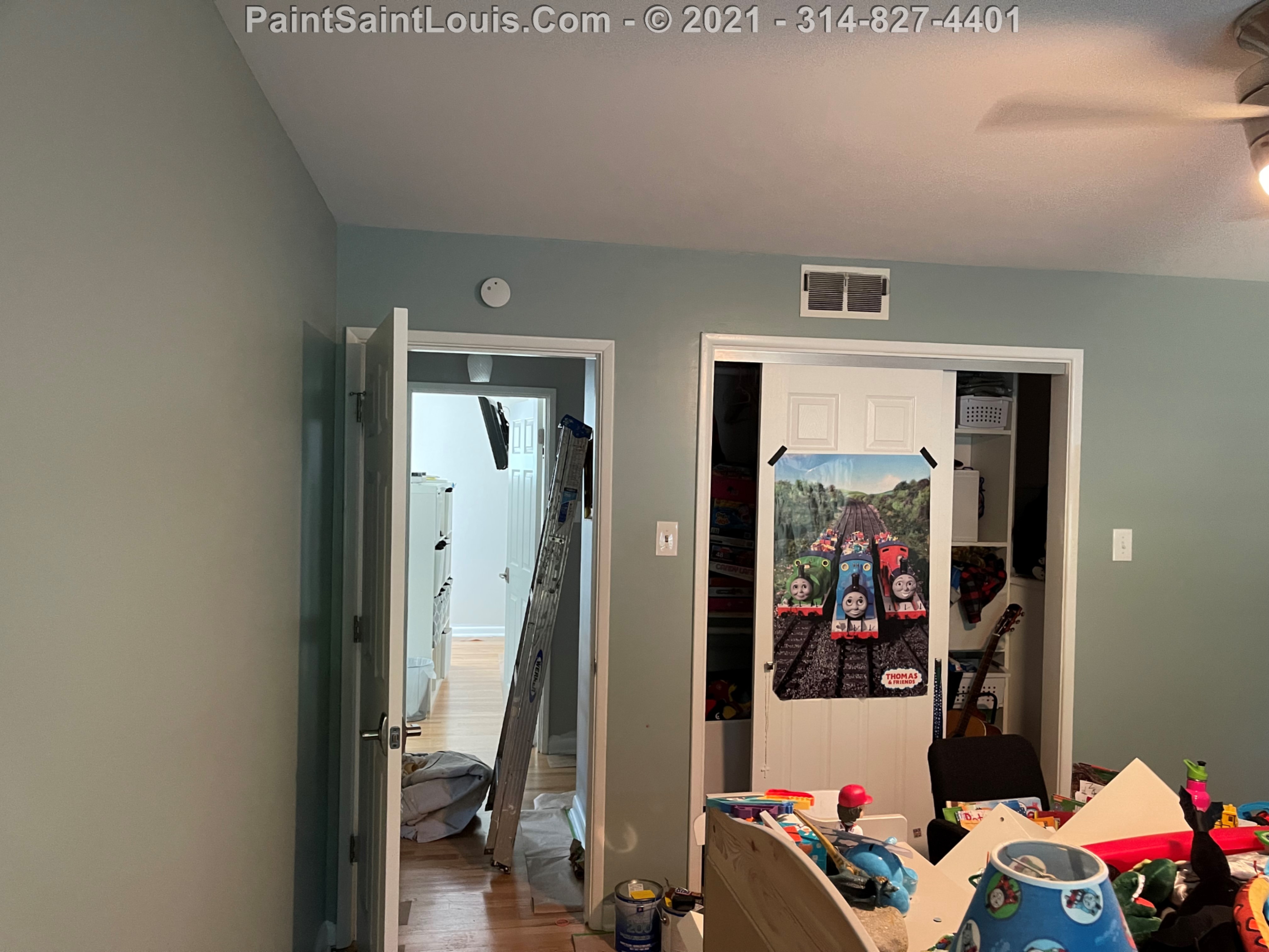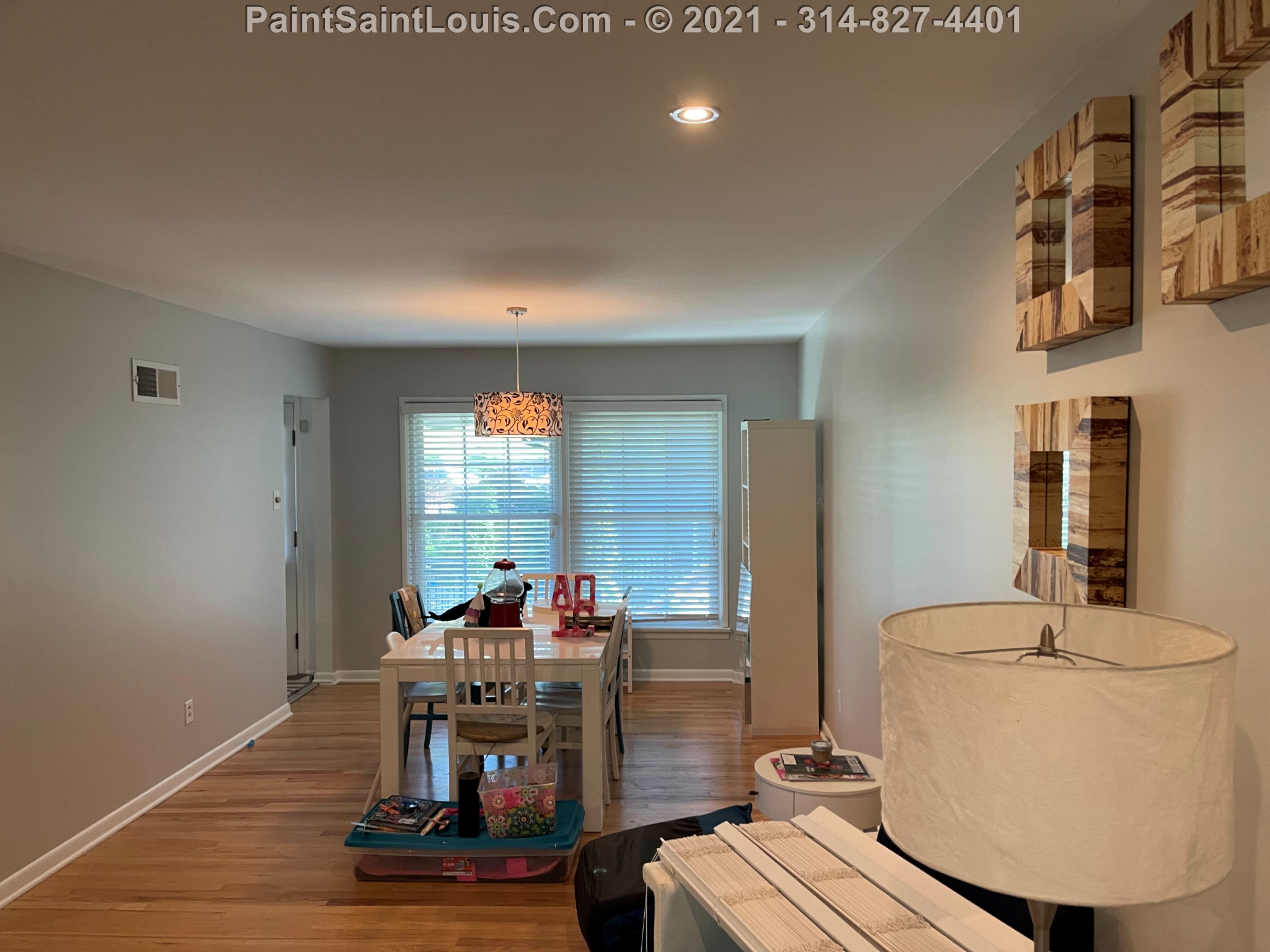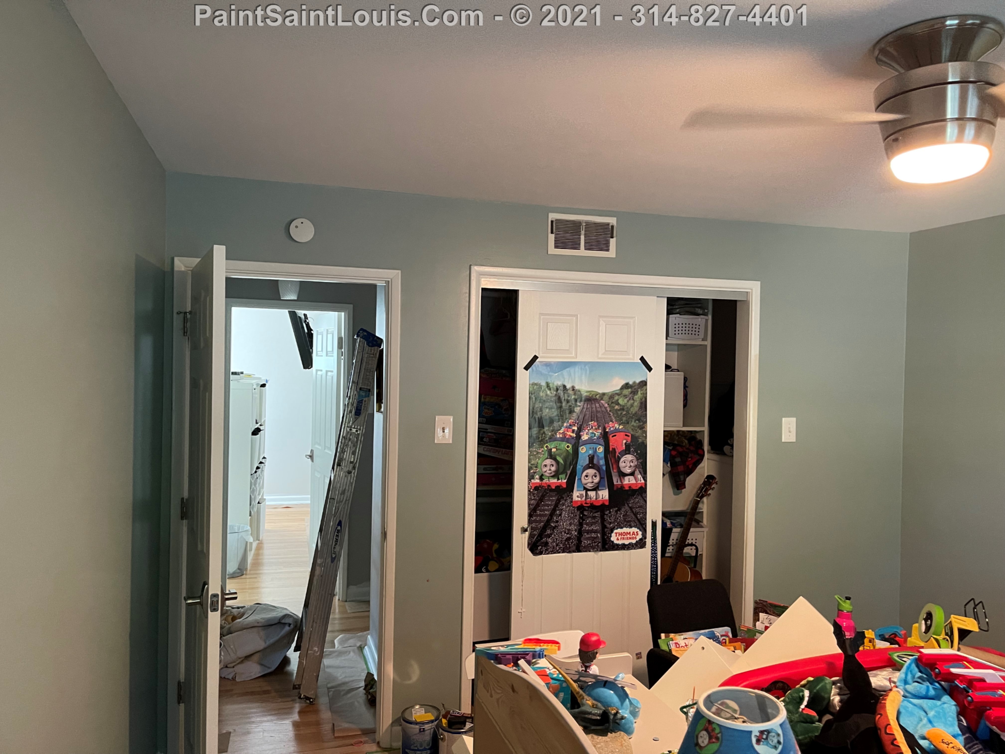 Customer had us come in and do a baseboard and wall repaint of the vast majority of this Kirkwood home. Most was a fairly matched wall color except for the accents, white in kitchen and orange in a secondary bedroom. The ceiling in the basement ‘office’ was also painted. In total this included the master bed, master bath, secondary bedroom, upper hall, hall bath, main living area, kitchen, office and basement family room. There were also a few areas of trim painted white and some white trim painted a darker color.