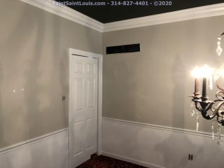 Dining Room: Gossamer Veil (Walls Upper) Extra White (Lower) Pure White (Trim) Laurel Woods (Ceiling)