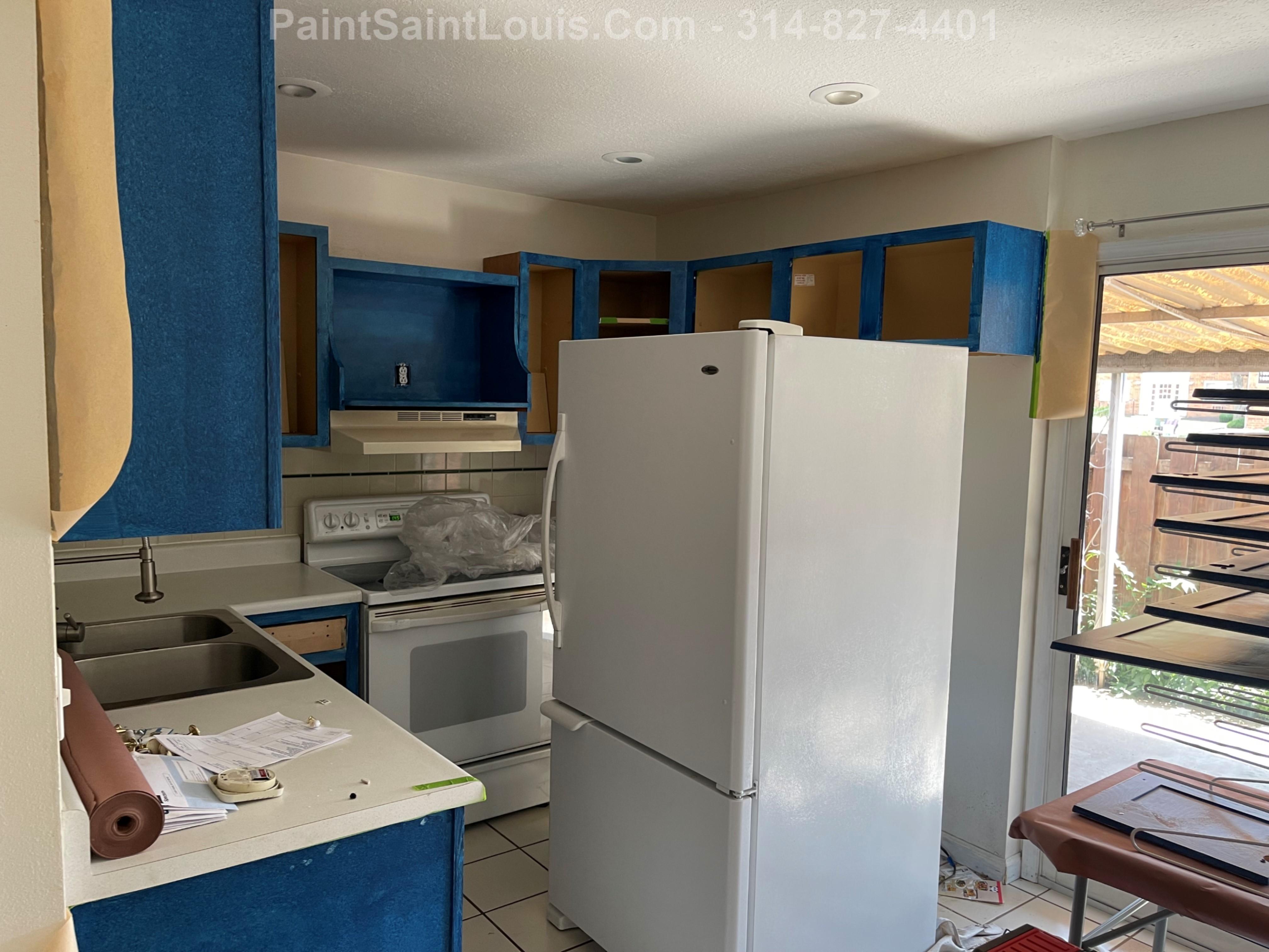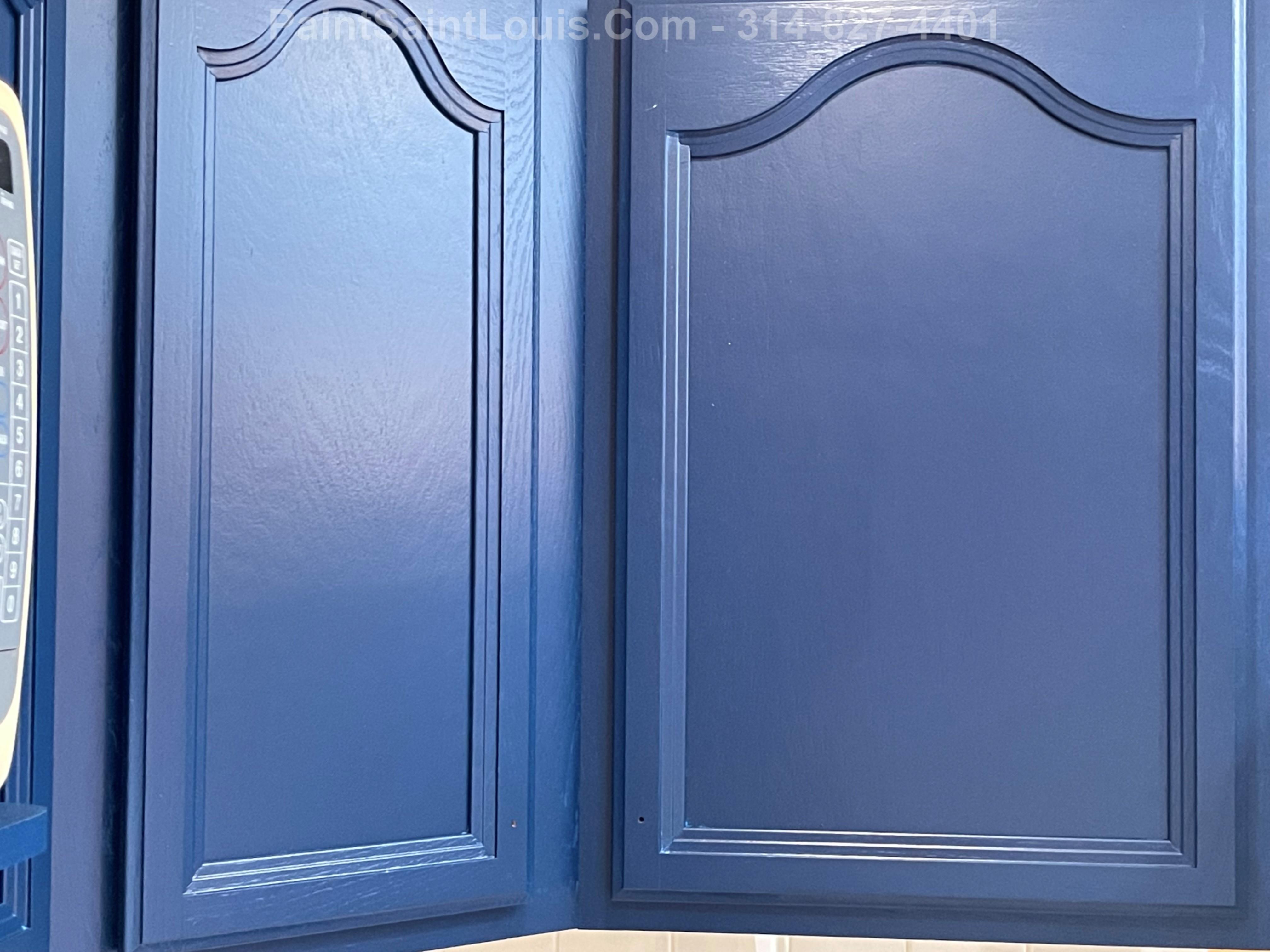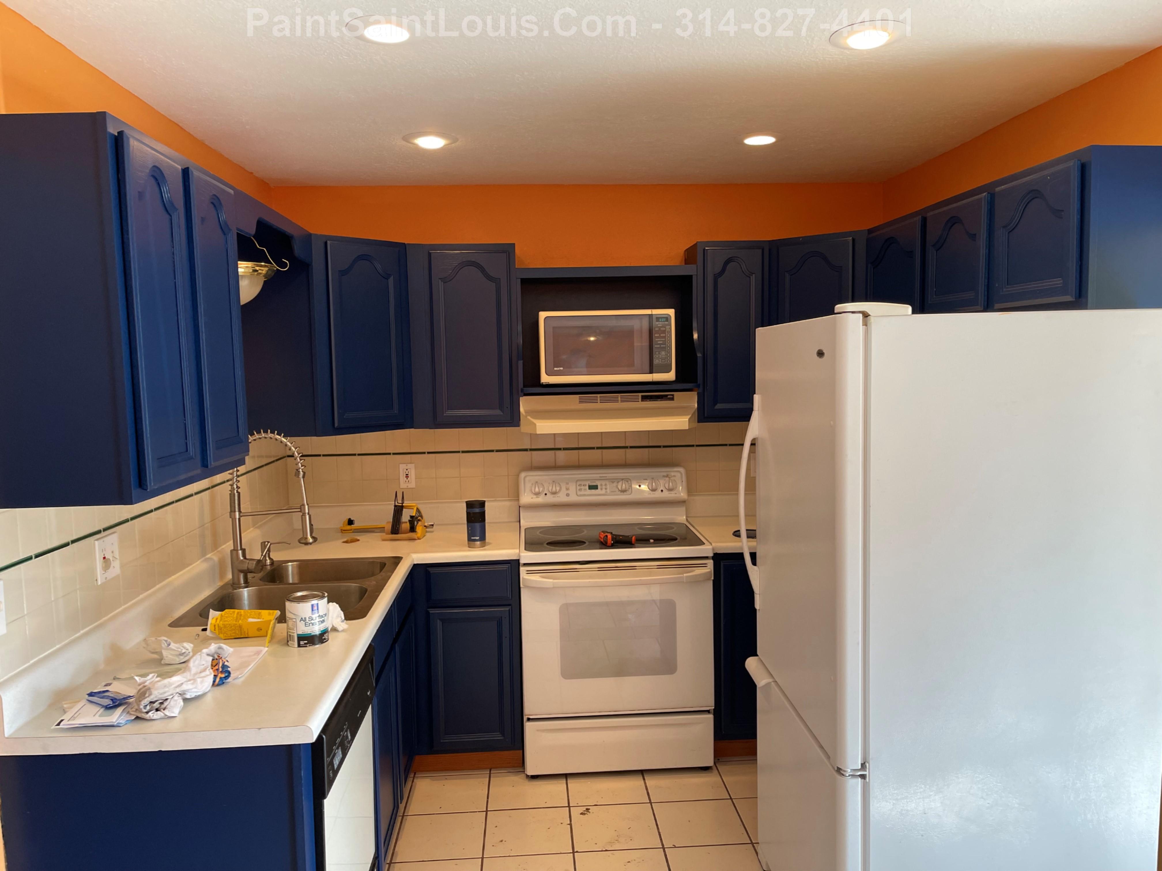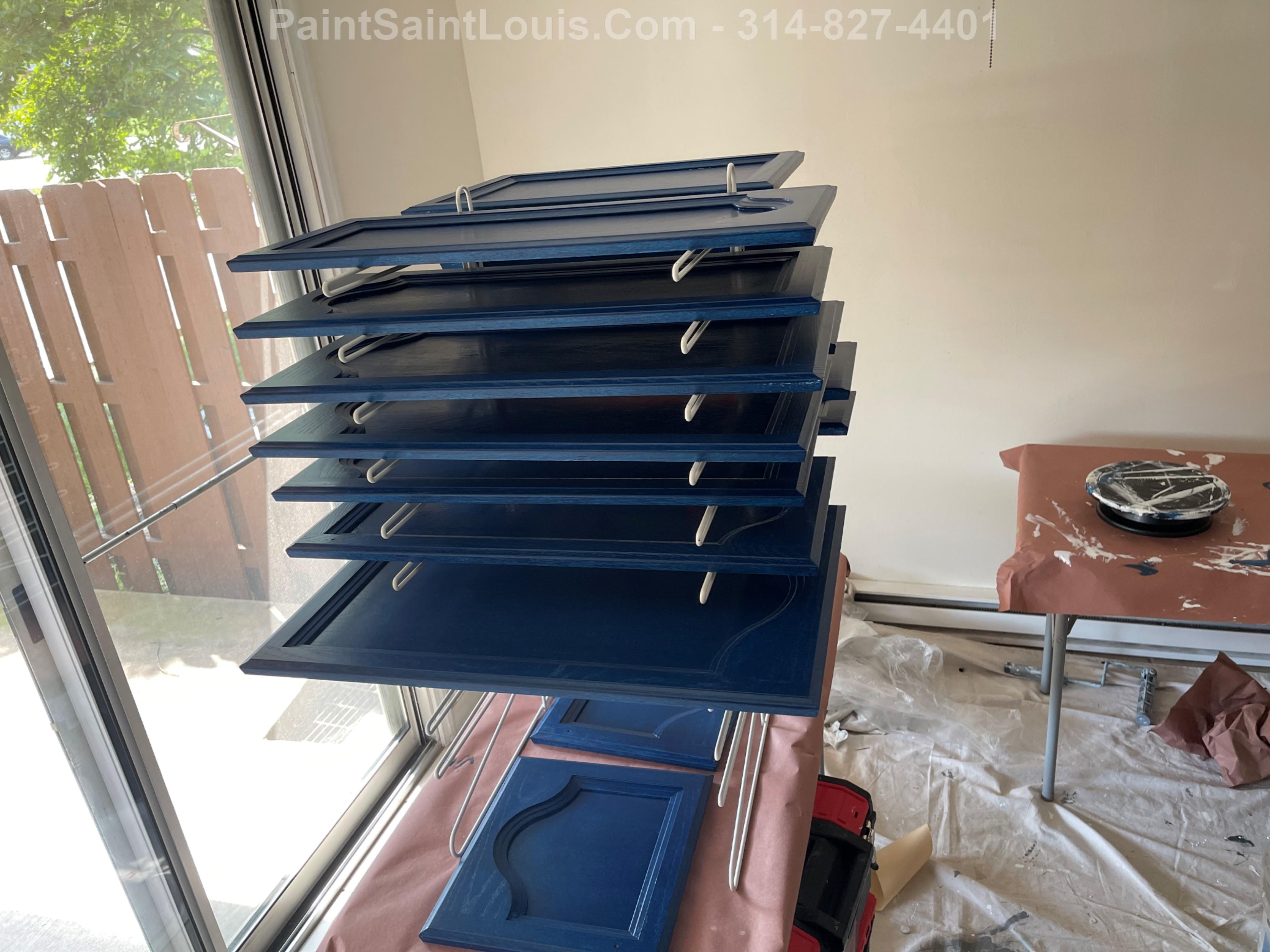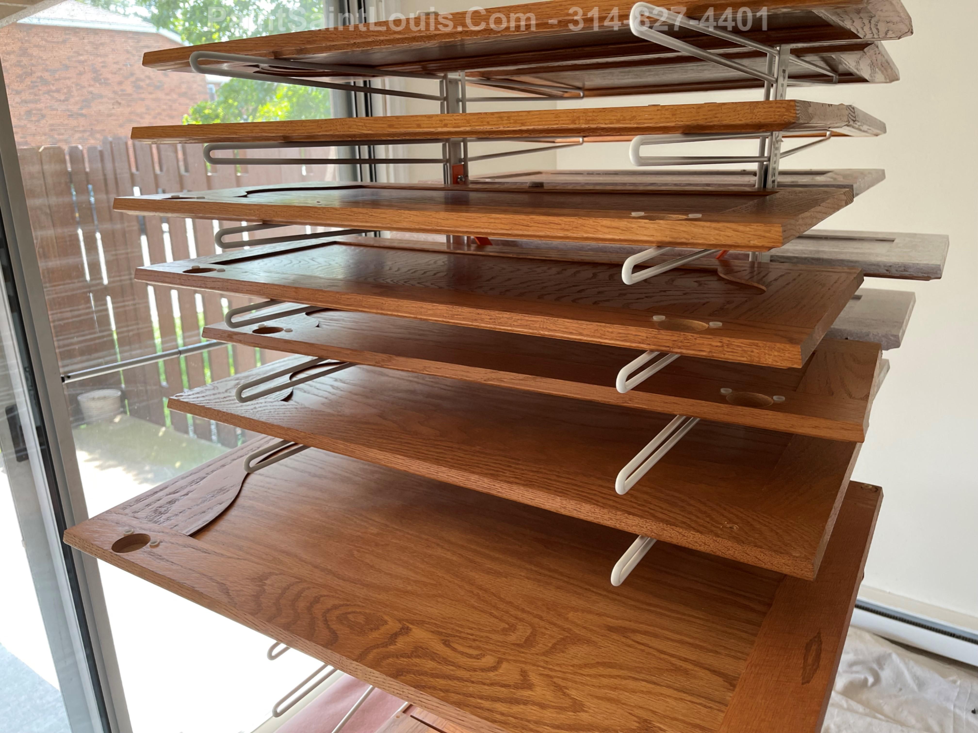 Repainted a small set of kitchen cabinets for this south county condo owner. Originals were the typical oak color and were painted right in the small condo kitchen because our setup and painting area is very compact and can be done in a relatively small area. In this case there was work being done in the basement, someone doing painting in other rooms and no garage to use. No problem. 🙂