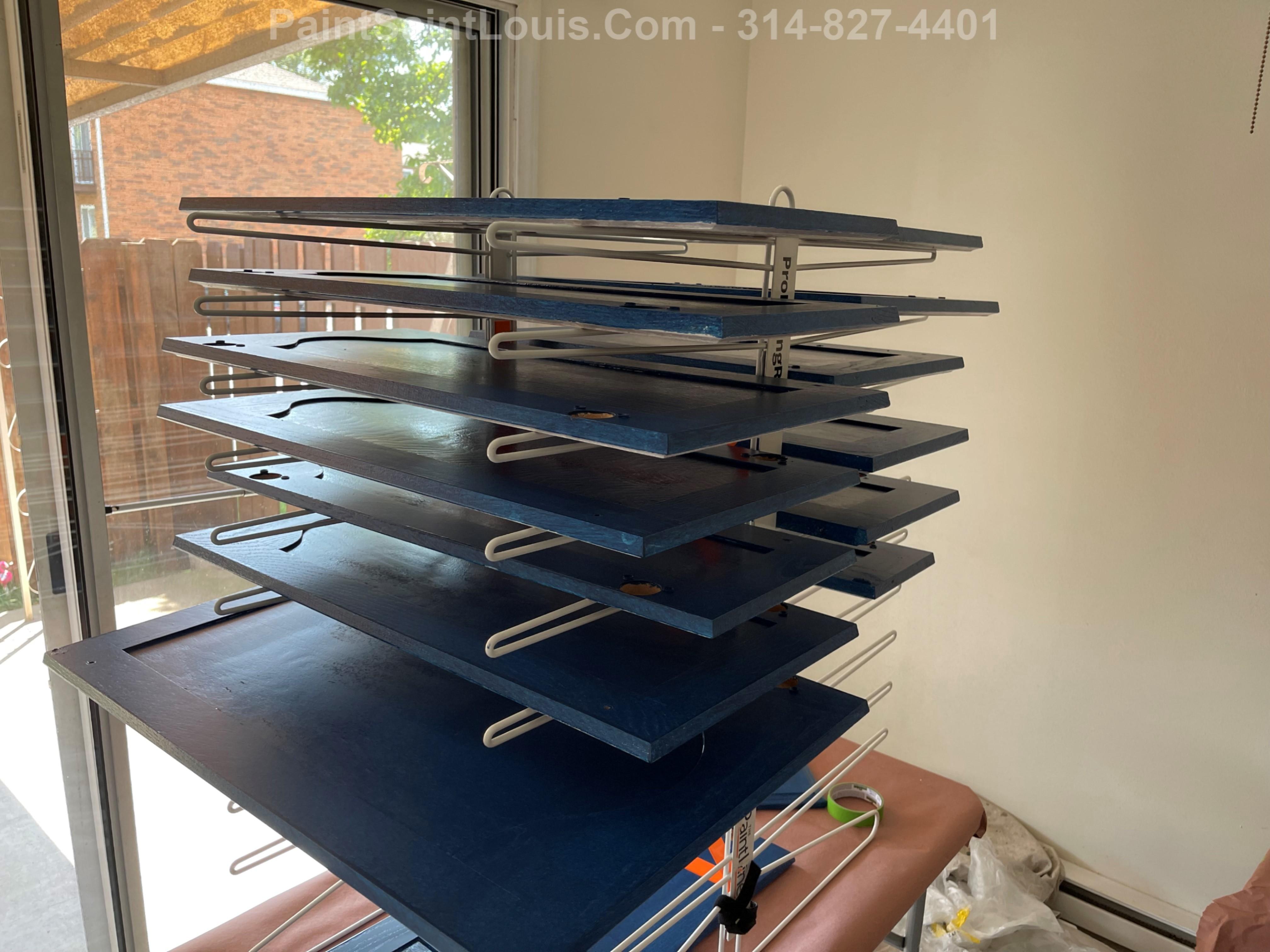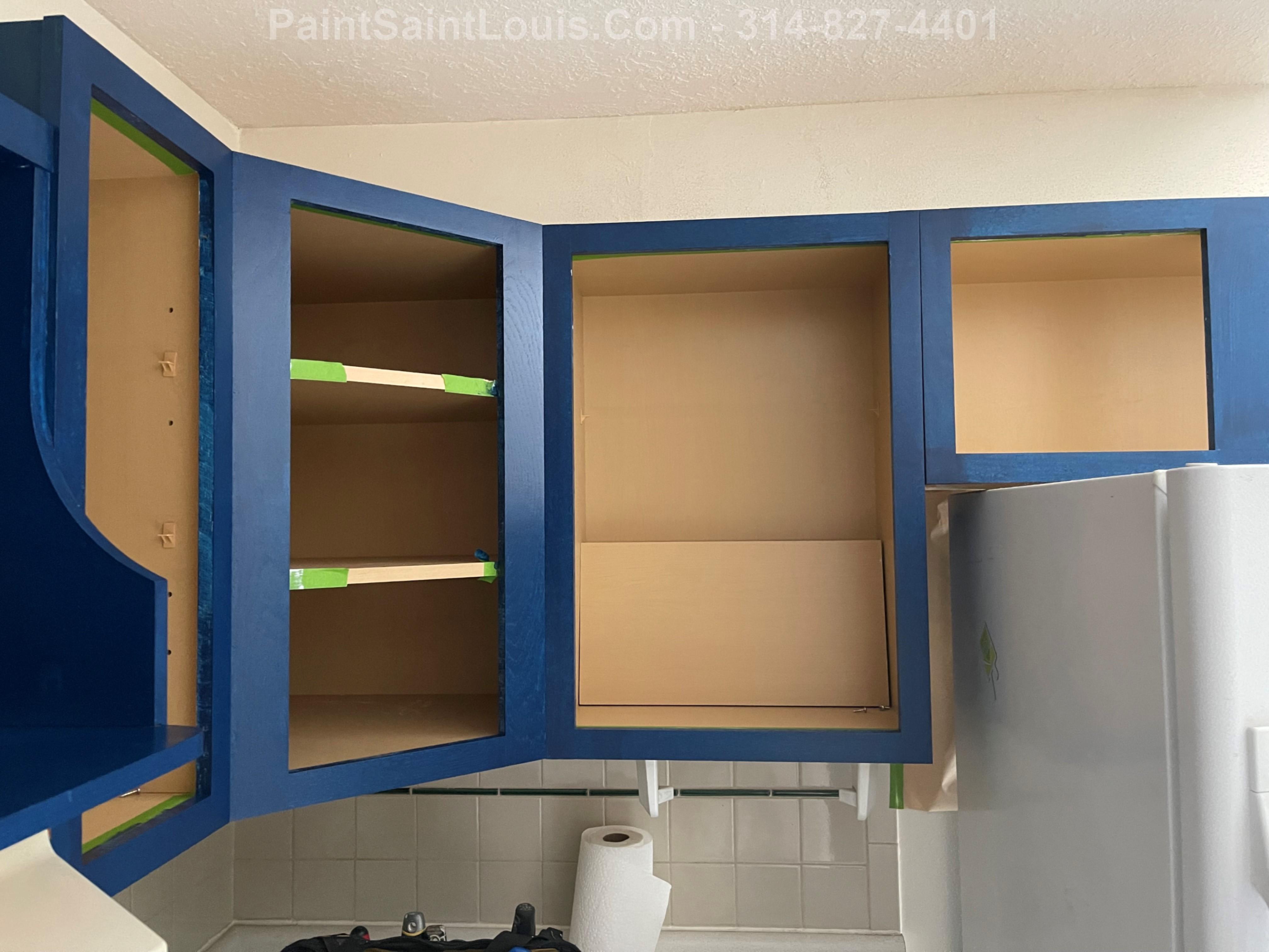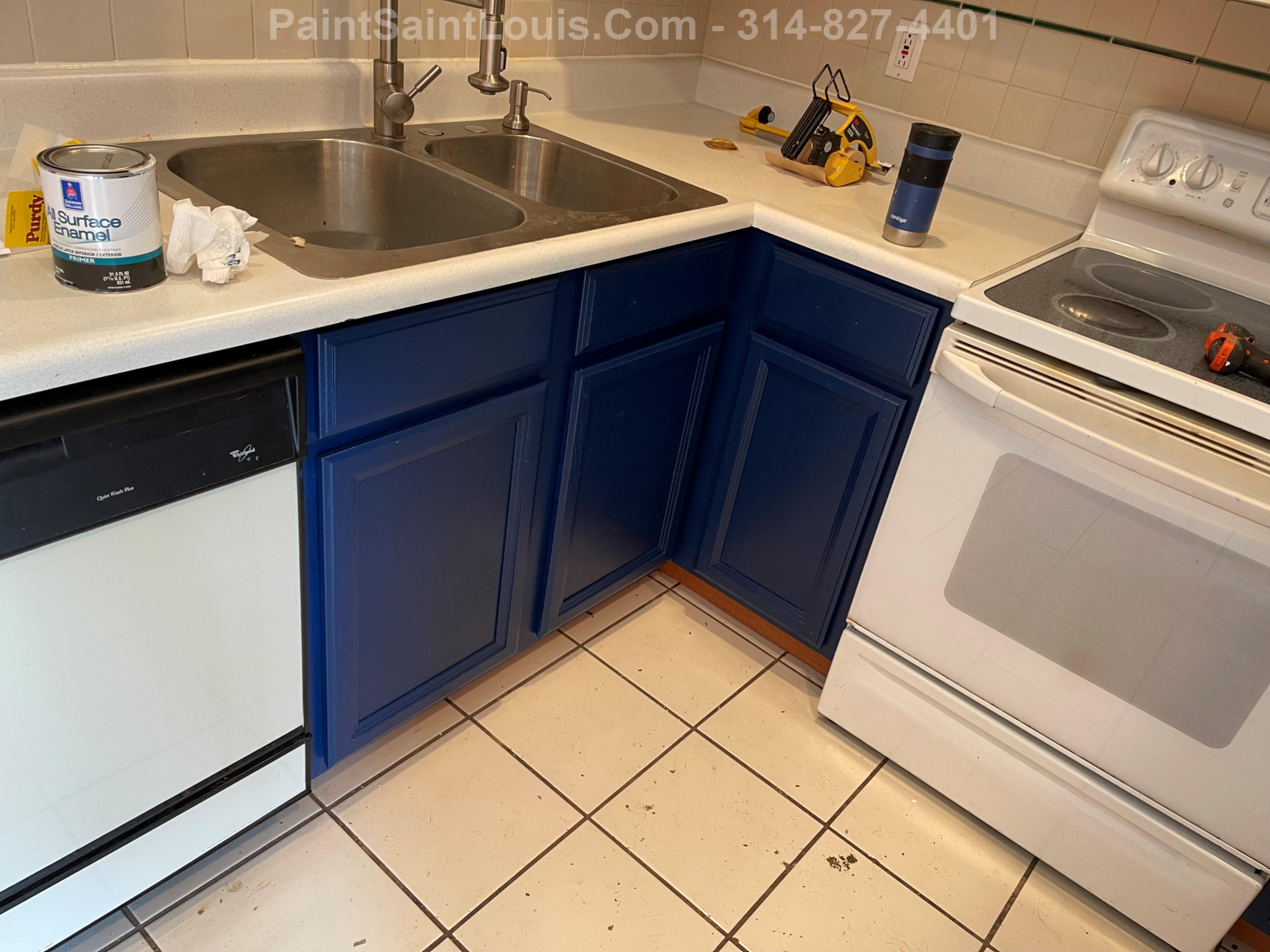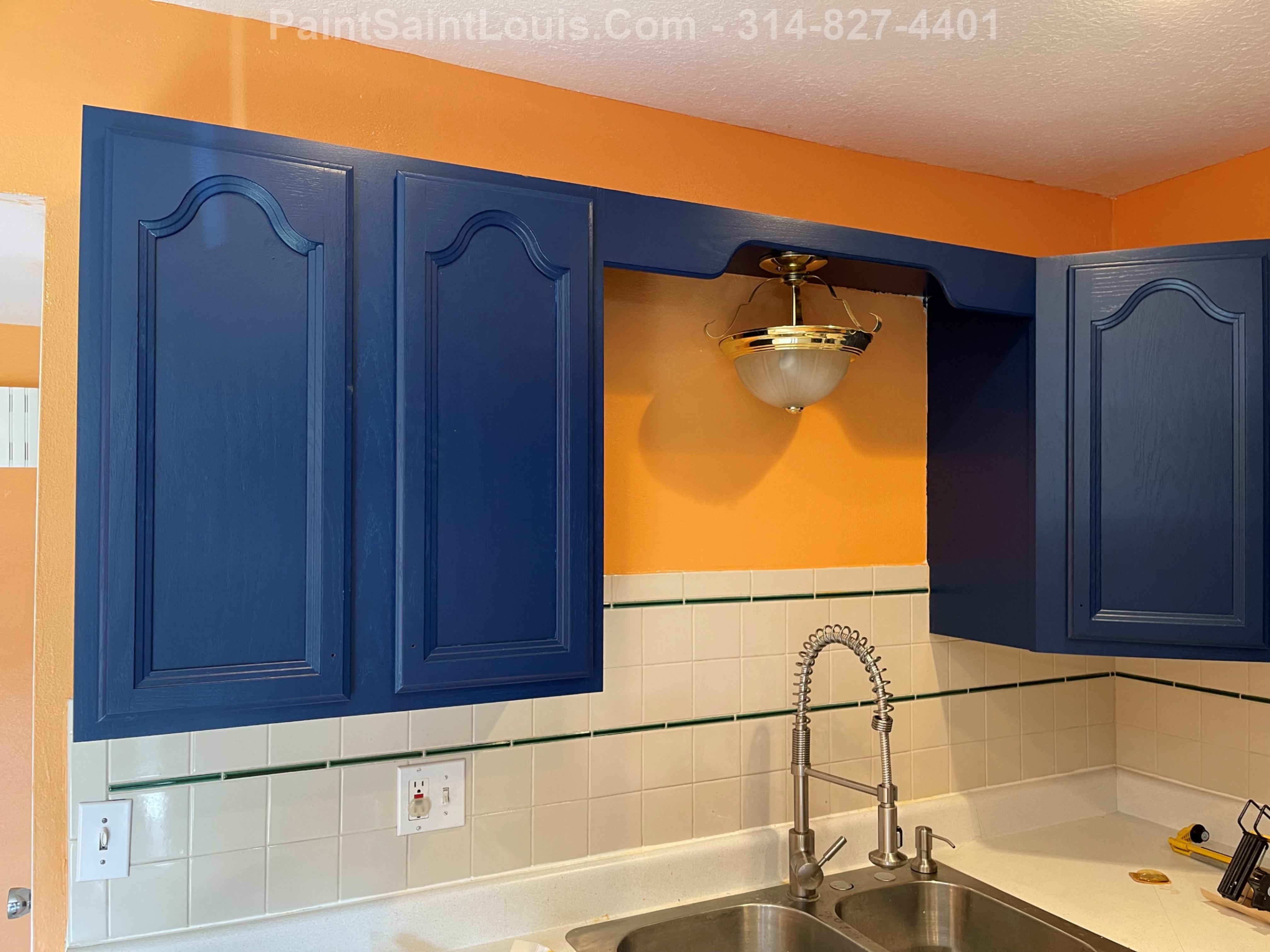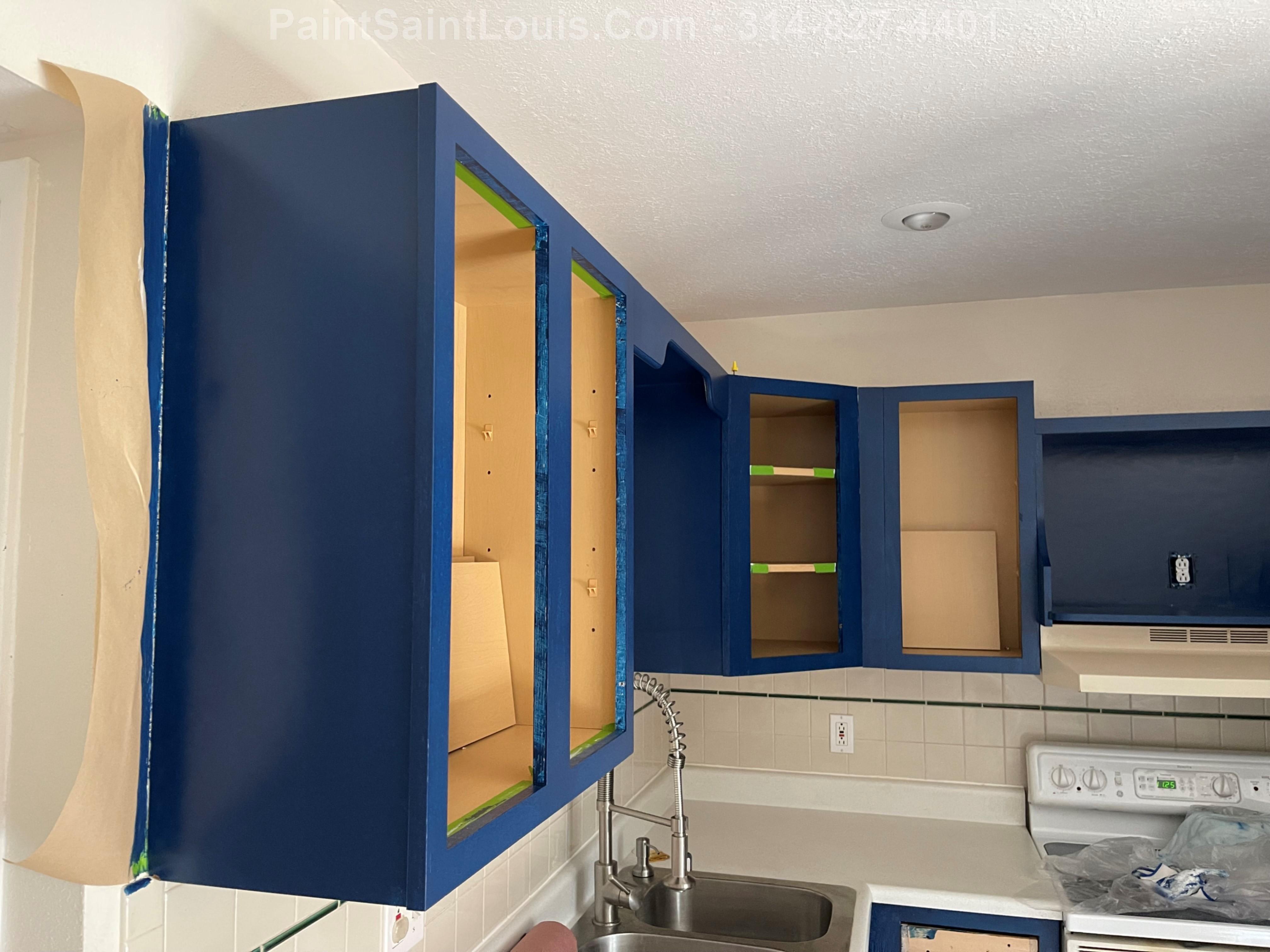 Repainted a small set of kitchen cabinets for this south county condo owner. Originals were the typical oak color and were painted right in the small condo kitchen because our setup and painting area is very compact and can be done in a relatively small area. In this case there was work being done in the basement, someone doing painting in other rooms and no garage to use. No problem. 🙂