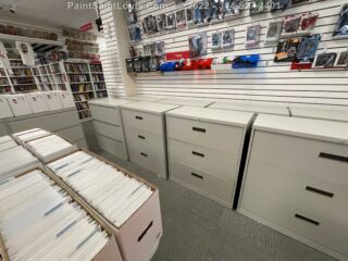 Mike at Comic Express in St. Charles gave us a call with a job a little outside of the normal interior painting fare but gave the perfect opportunity to test modern painting products with some old school methods. Why? The time involved in picking up this many units to take elsewhere to spray and return would have been cost prohibitive and there was no area of the retail building that this could be done. These had to be painted right on the retail floor of the store and was done while the business was open.